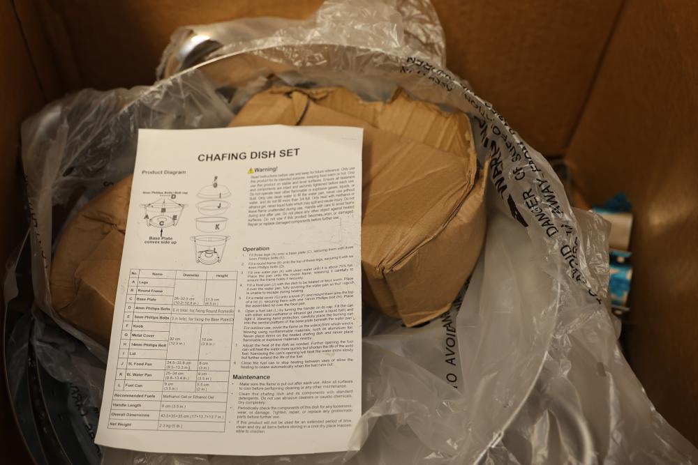 NPOUE Chafing Dish Buffet Set With Glass Lid and Stainless Steel Construction. Designed for food-grade use, this set includes a built-in lid holder and is dishwasher safe. Repackaged from its damaged original box into a new box.