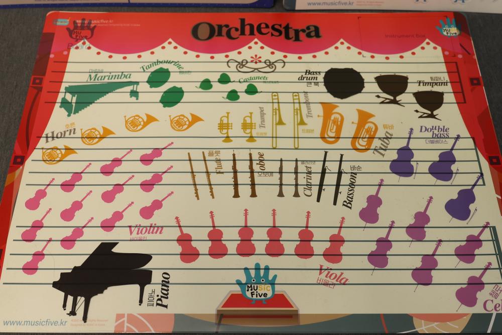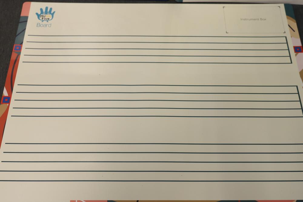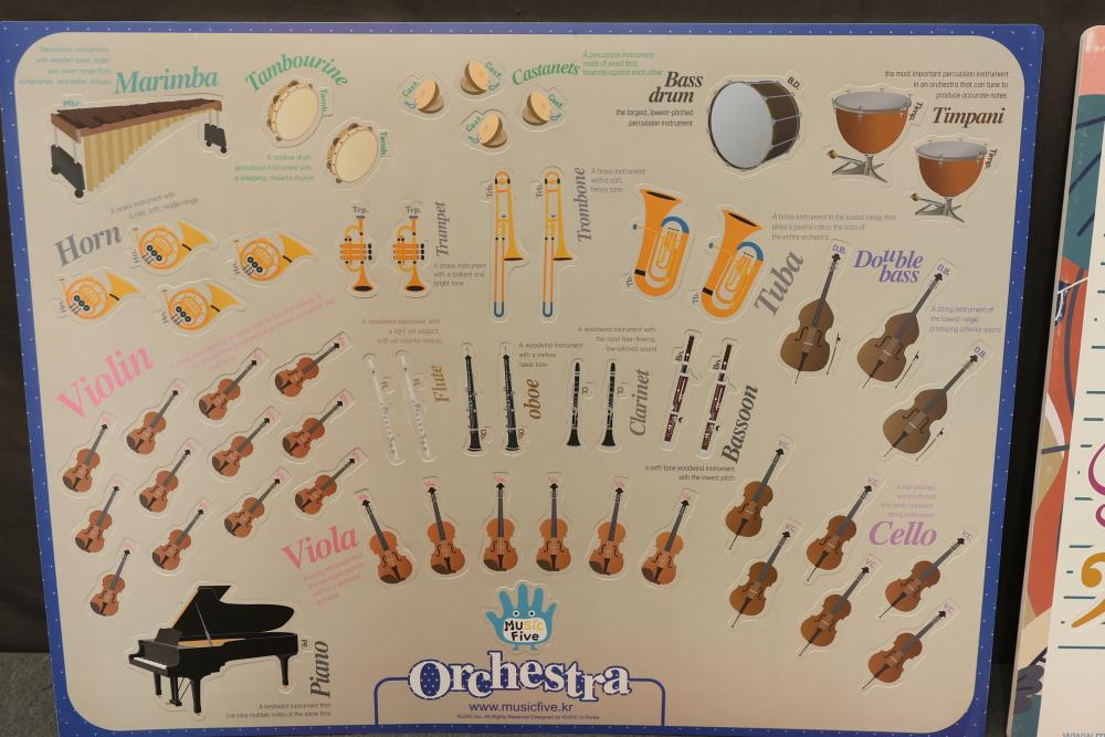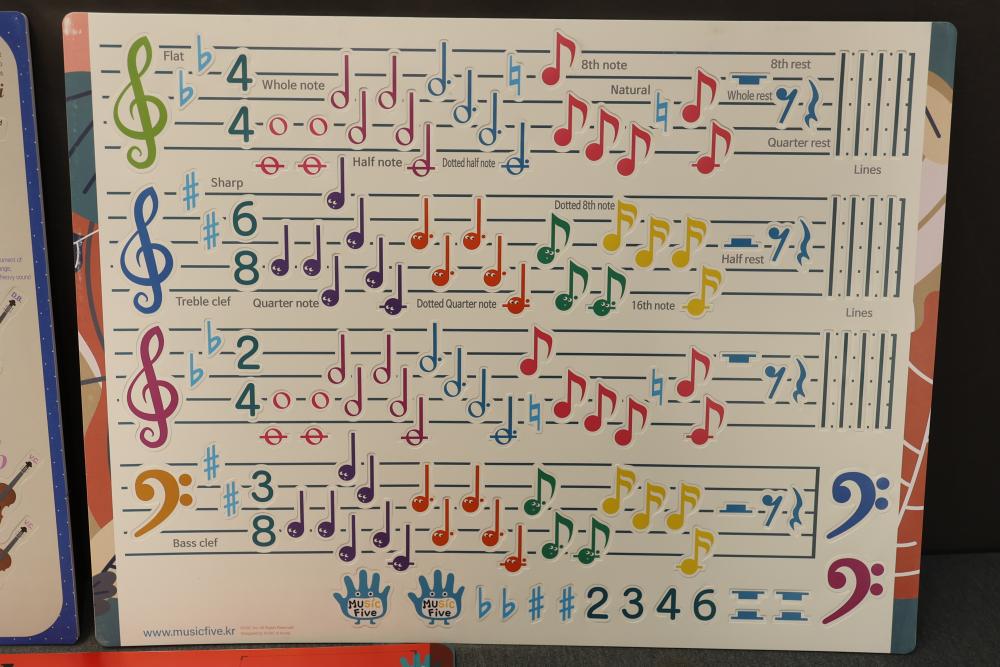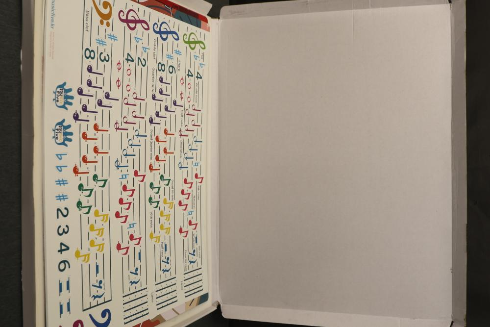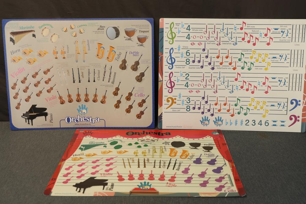 MusicFive Music Notes and Instruments Visual Aid Board Toy Set for Children Age 5-6. Includes visual aids featuring musical notes, instruments, and orchestral themes designed as an educational toy for young children. Includes multiple laminated boards and teaching tools. Pickup only.