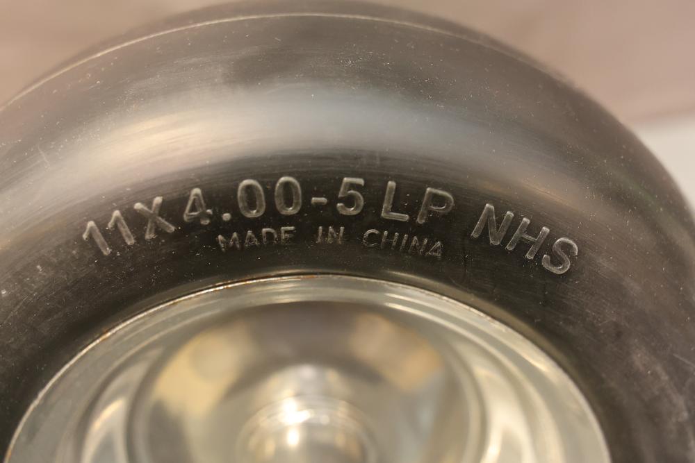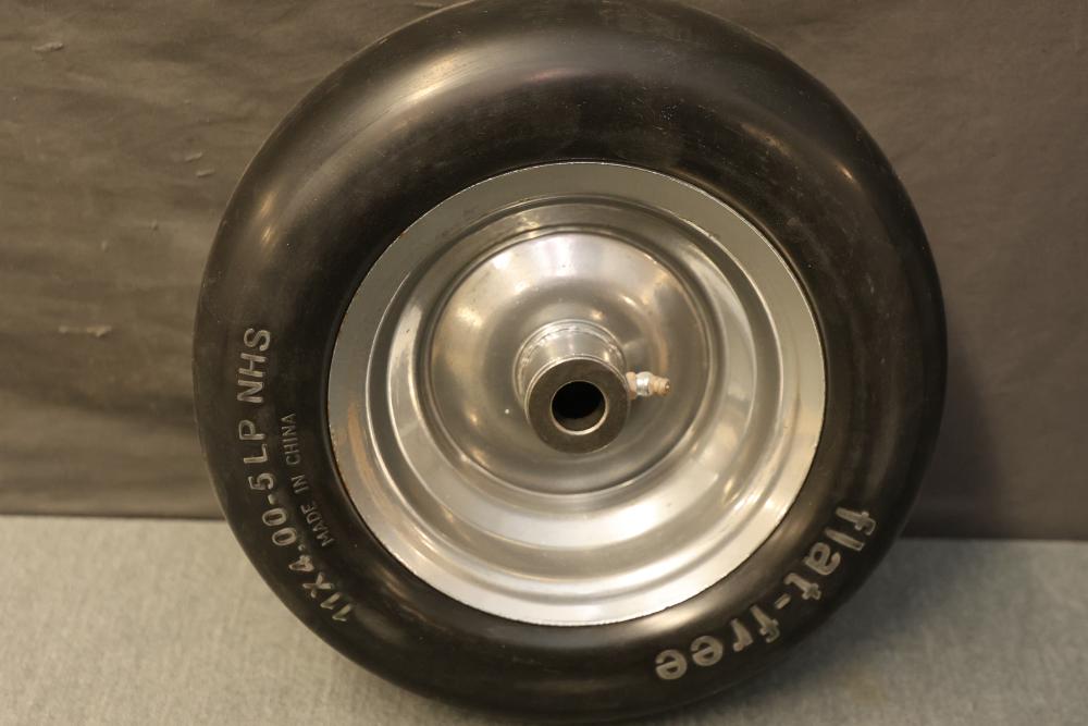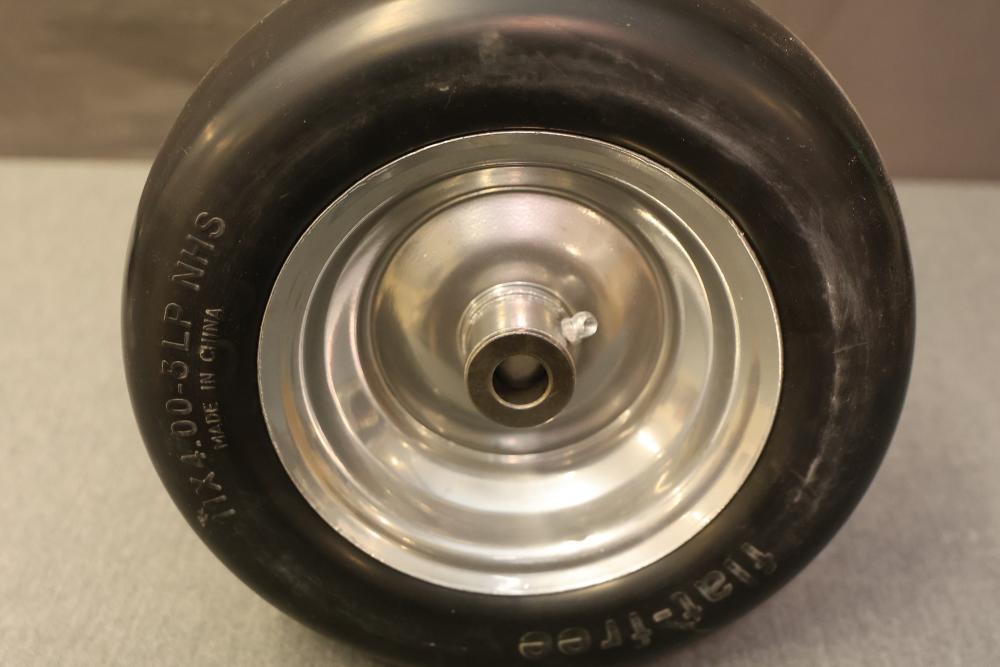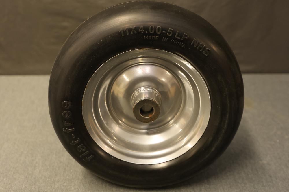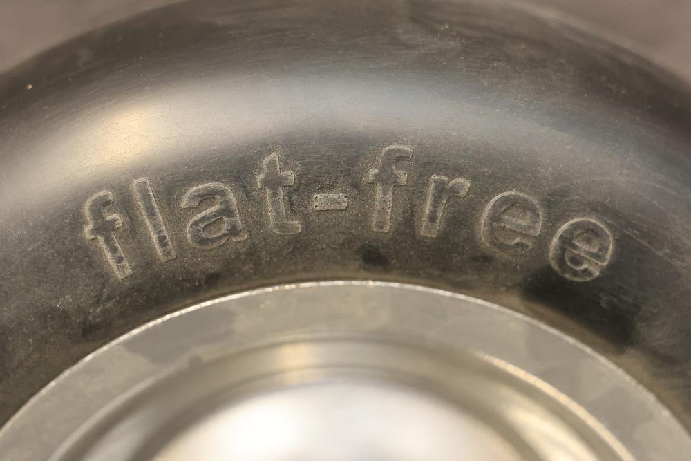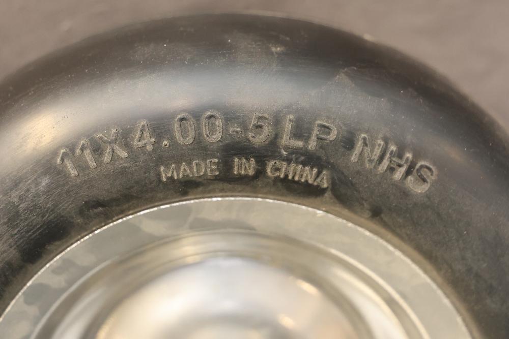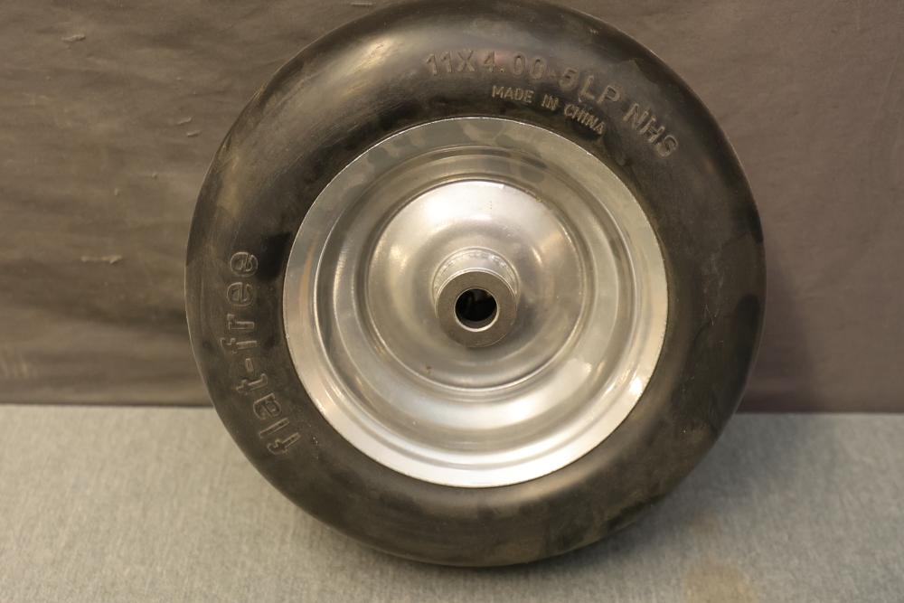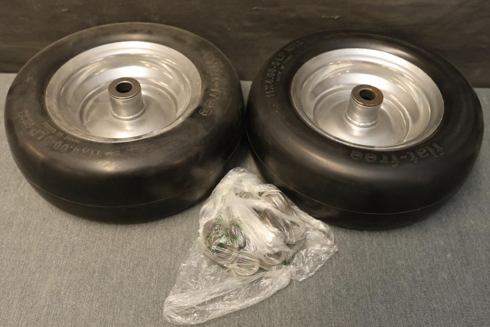 Marastar 00232 2-Pack Universal Fit Flat-Free 11x4.00-5 Tire and Wheel Assembly, Lawn Mower Replacement Tires. Includes two flat-free tires with a universal fit design, made from durable materials for lawn mower replacements. Hardware included as shown. Slight wear visible on some components. Pickup only.