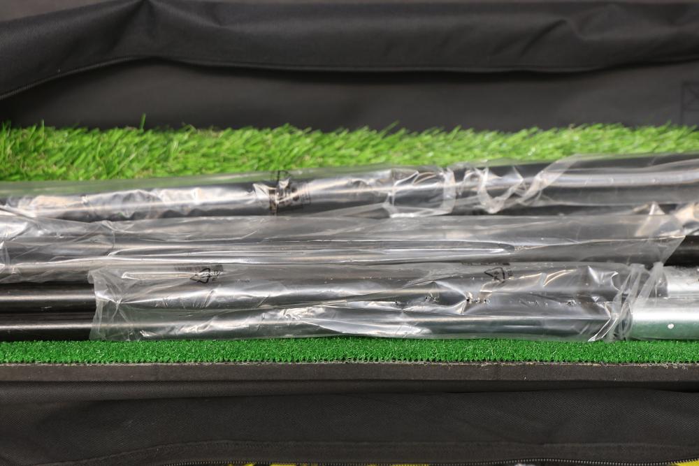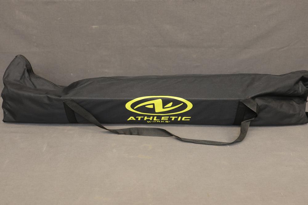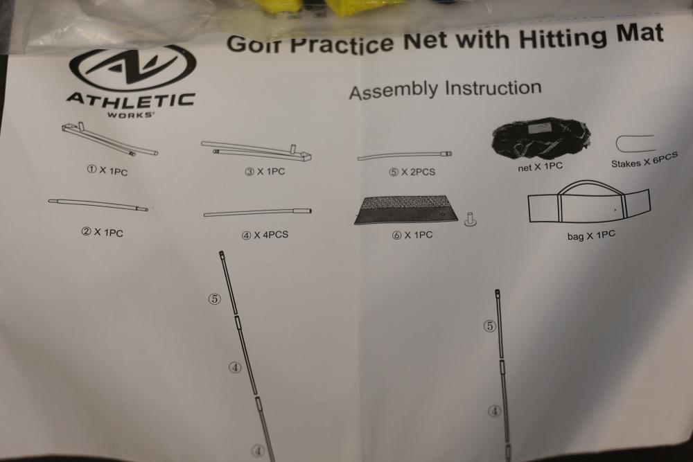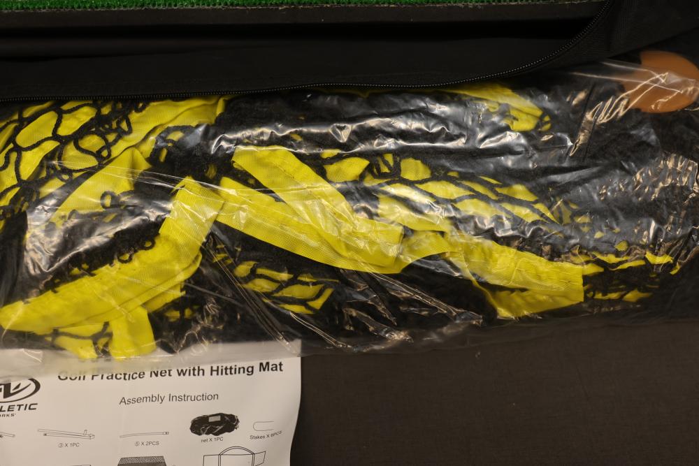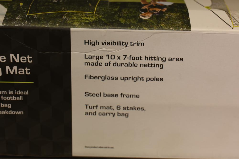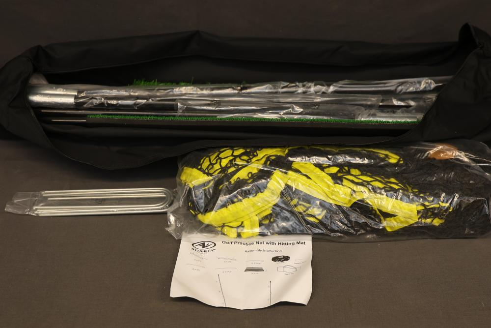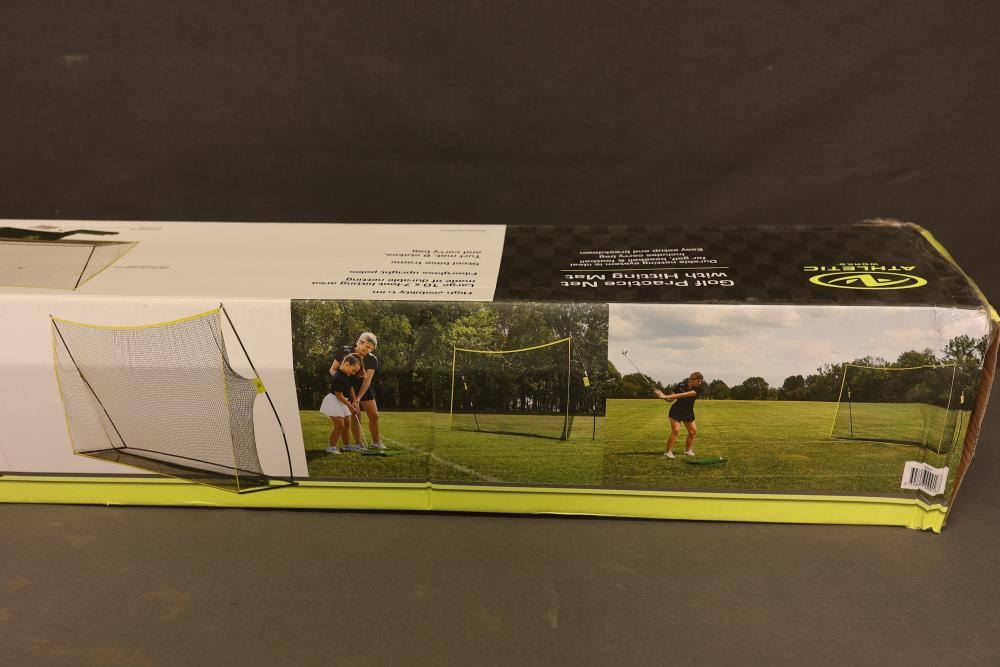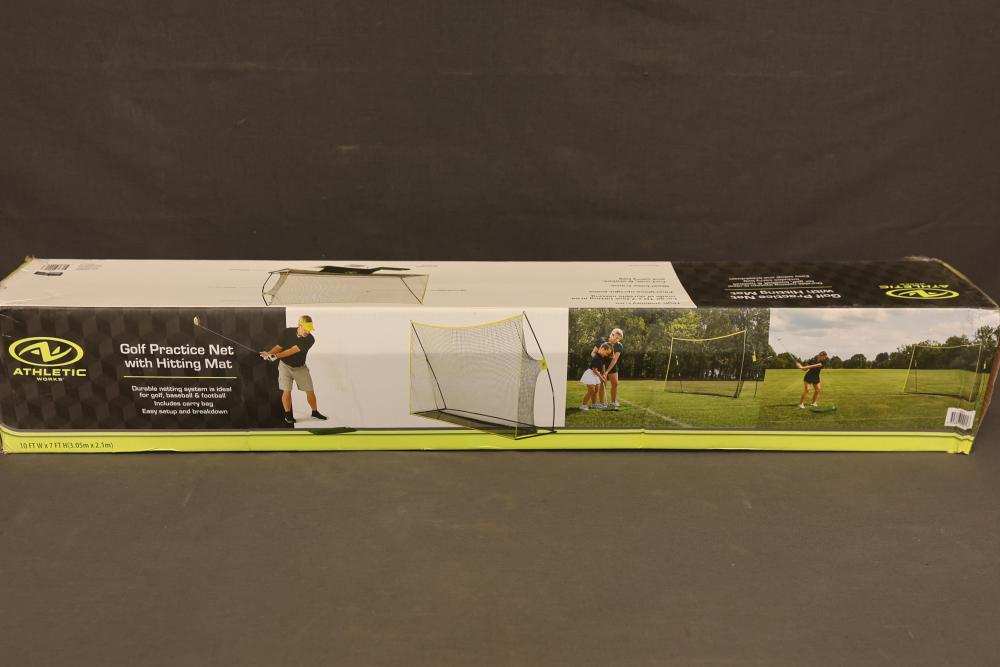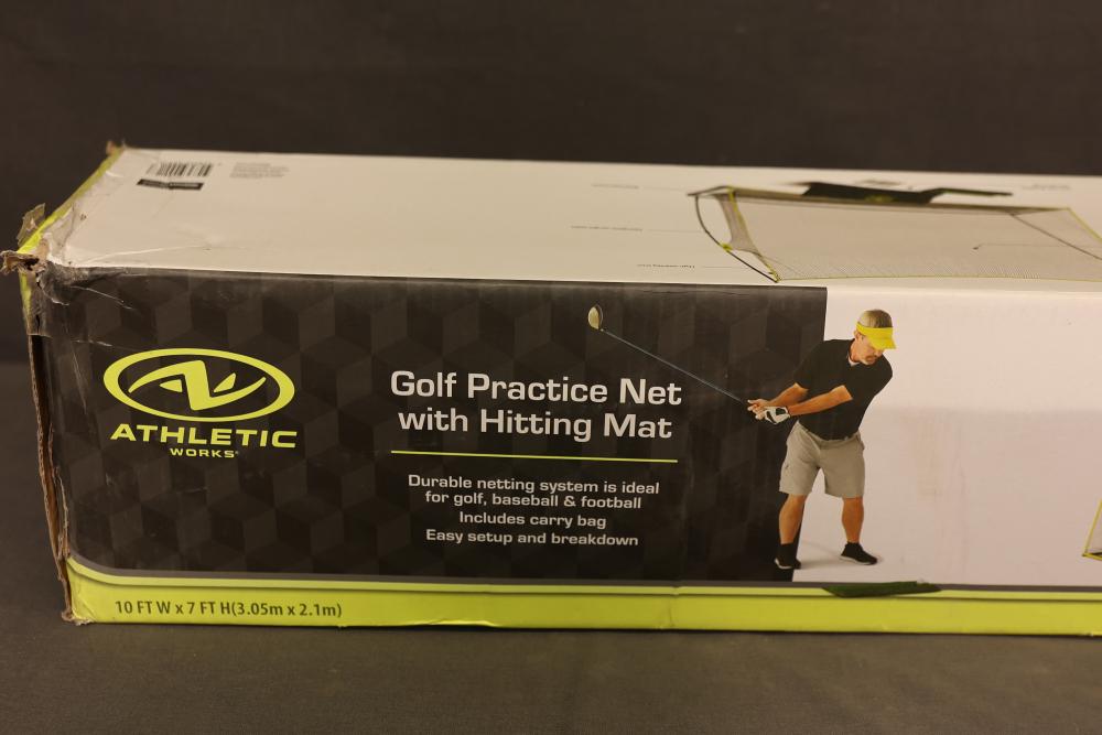 Athletic Works Golf Practice Net with Hitting Mat. Includes a large 10 ft x 7 ft hitting area made of durable netting, fiberglass upright poles, steel base frame, turf mat, six stakes, and carrying bag. Ideal for practicing golf, baseball, or football. Features high visibility trim for easy targeting. Pickup only.