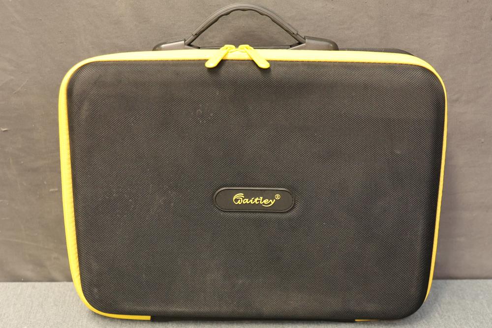 Waitley Large Storage and Holder Case for Tools and Batteries. Designed with internal compartments and foam lining for secure storage of tools and batteries. Features a zippered closure, carrying handle, and durable construction. Compact design for easy transportation. Pickup only.