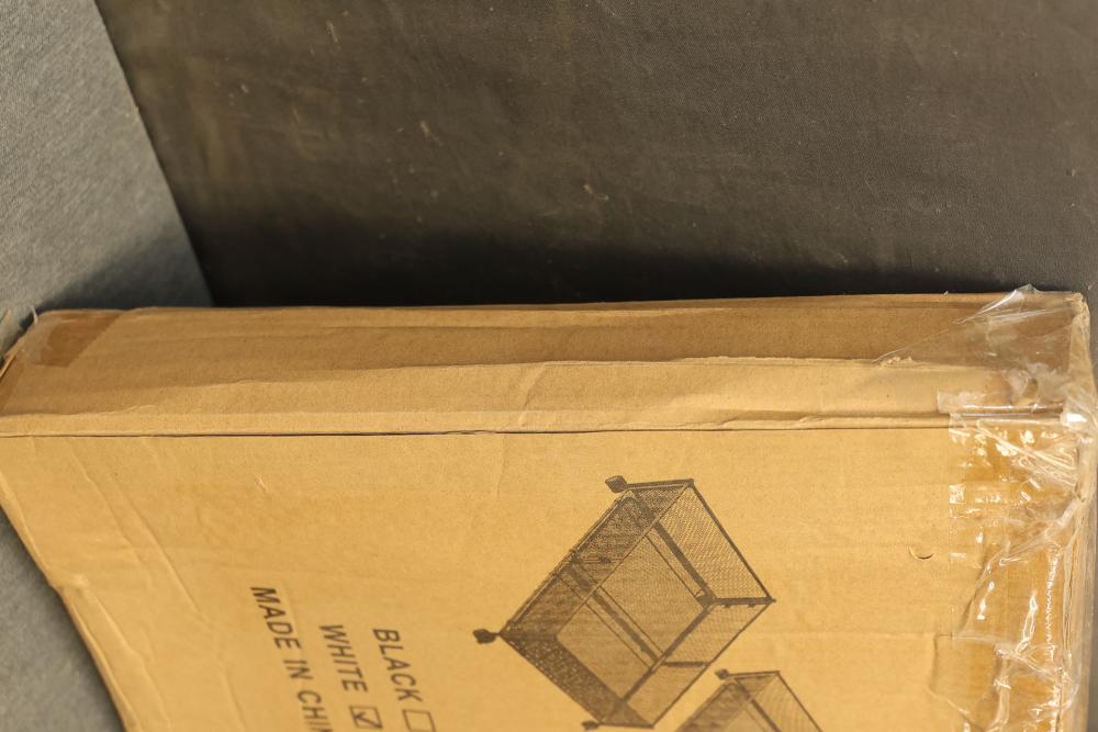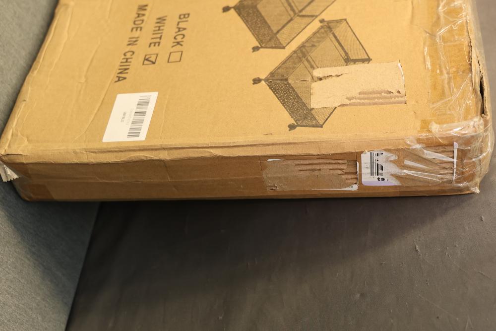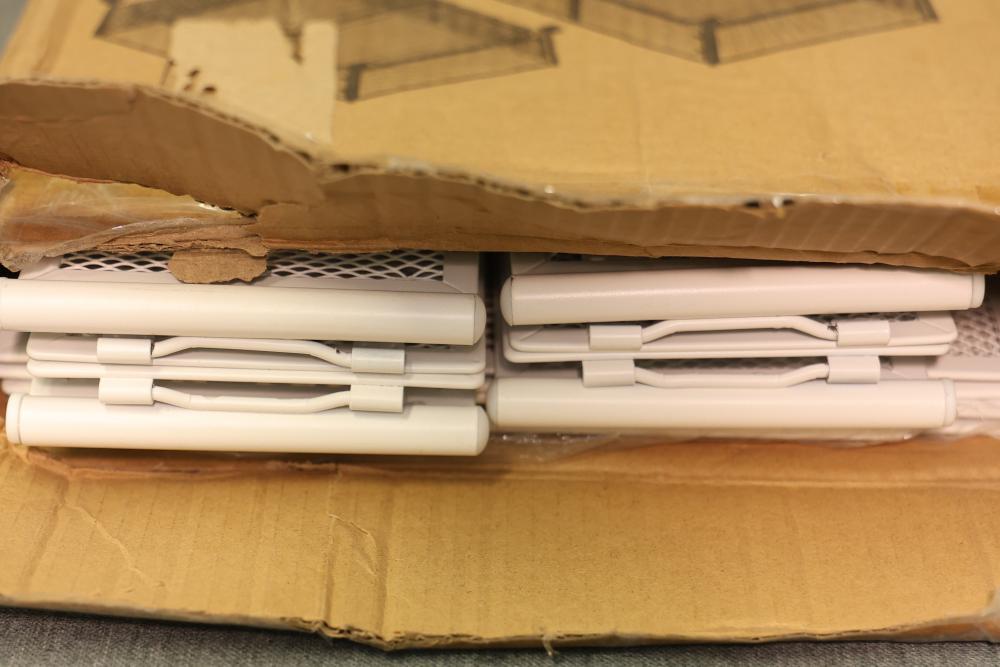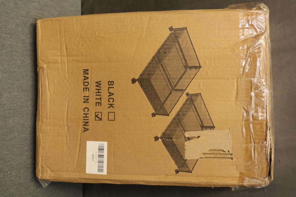 V-Lafuylife Under Bed Storage Containers with Wheels in White - Package of 2. The set includes two metal storage containers in white, each equipped with wheels for easy mobility. Designed for under bed use, they feature breathable mesh construction for visibility and ventilation. The item is in its original packaging, which shows signs of wear. Pickup only.
