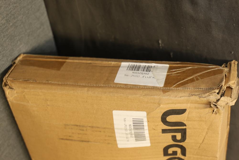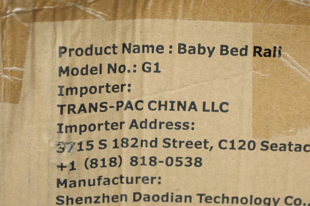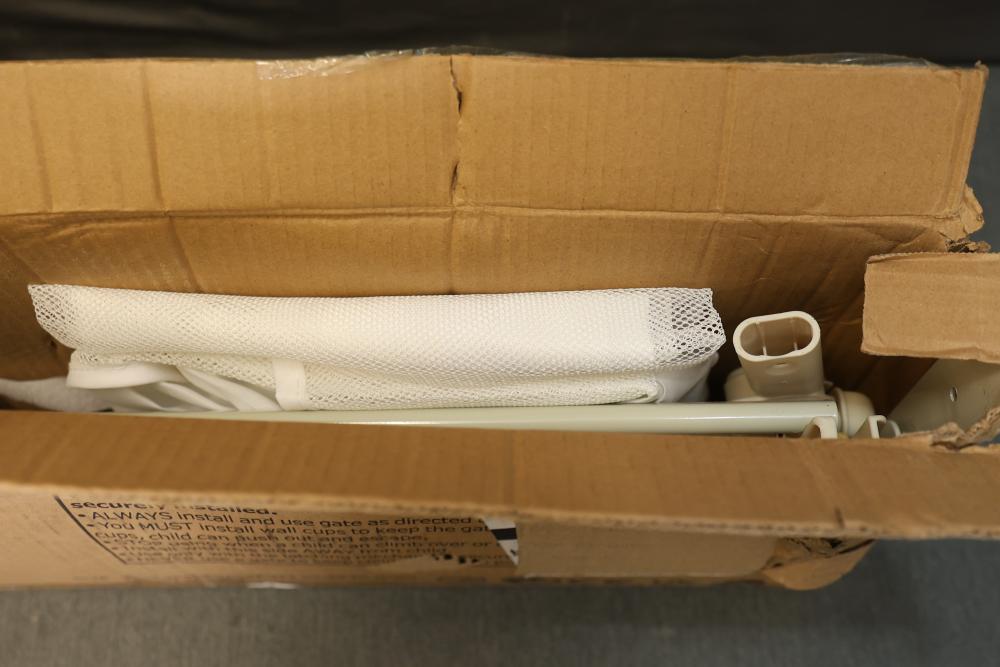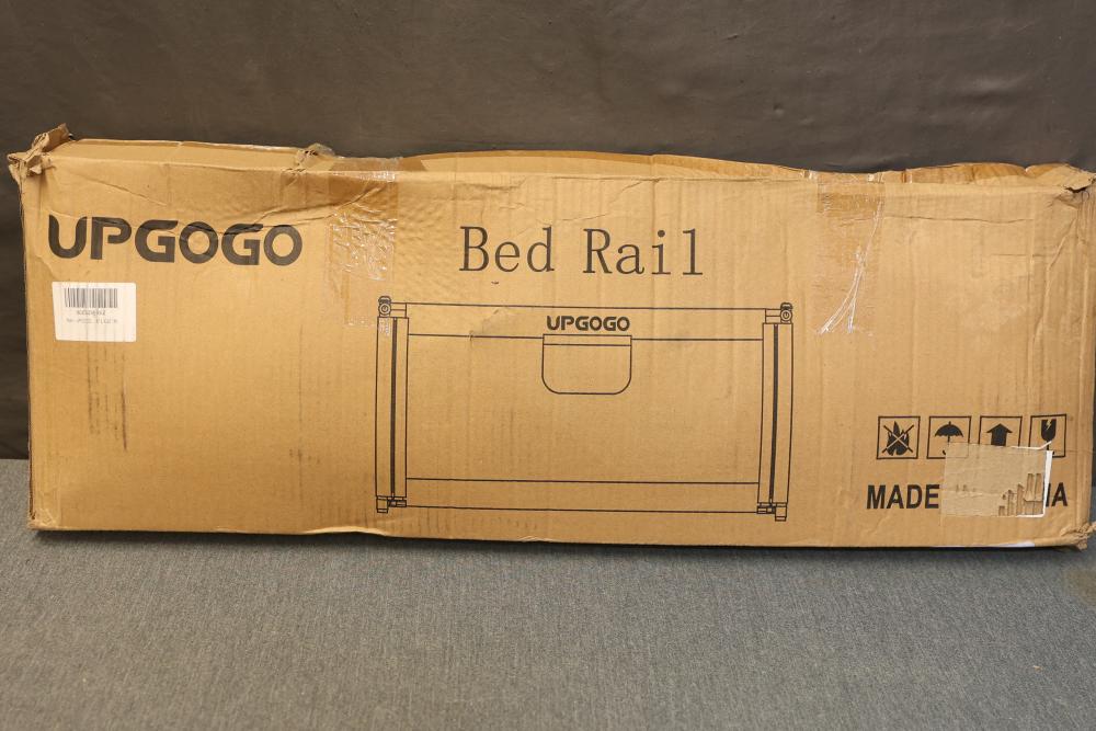 Upgogo G1 Folding Bed Rail for Toddlers, Safety Guard for Bunk and Full Size Beds, 74.8 Inches Long in White. Features a durable design with a white mesh safety guard. The item measures 74.8 inches in length and is designed for bunk and full-size beds. Packaging shows wear and tear. Pickup only.