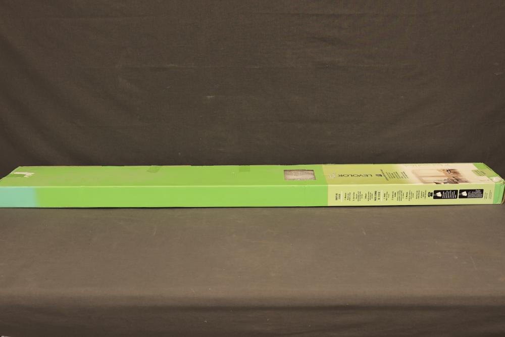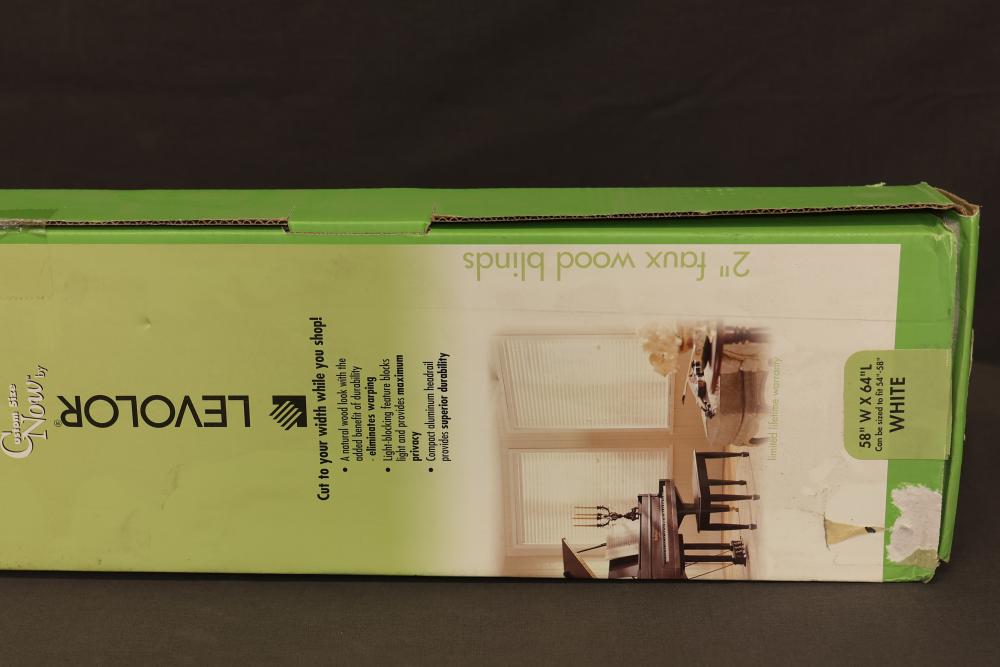 Levelor 2-Inch Wide Faux Wood Blinds - White - 58-inches Wide x 64-inches Long. These blinds feature a durable faux wood construction with a white finish, measuring 58 inches wide by 64 inches long. Includes original packaging with visible wear and tape. Pickup only.
