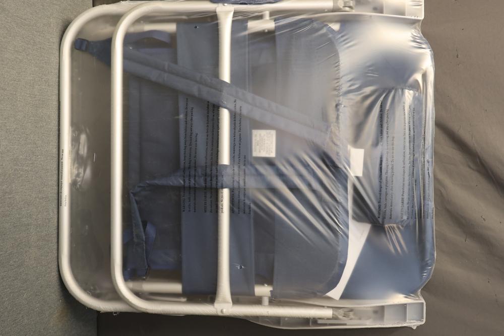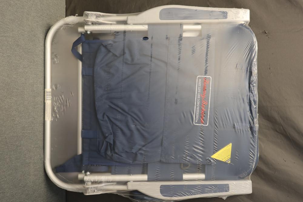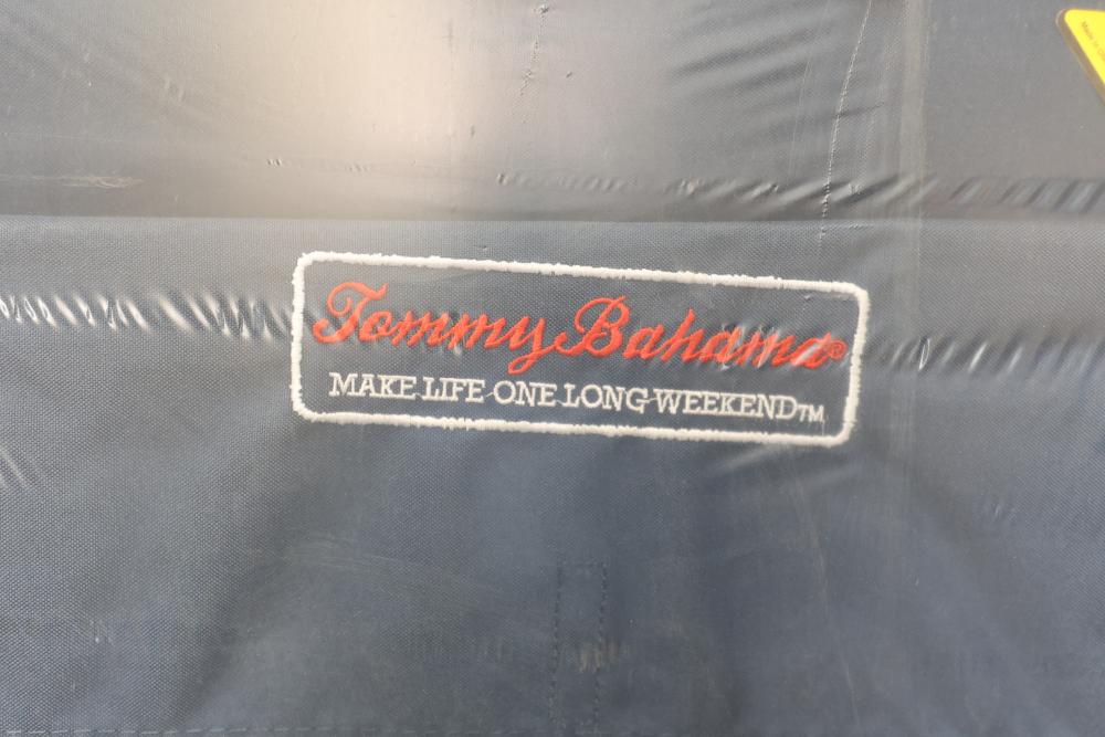 Tommy Bahama ASC537TB-63-1 Big Boy Backpack Chair. Designed with a sturdy white frame and blue fabric featuring an embroidered logo. Includes adjustable backpack straps, a cushioned headrest, and side storage features. Item is new, still in original packaging. Pickup only.