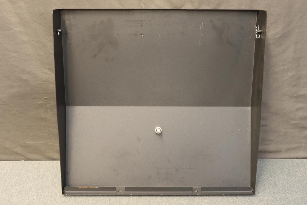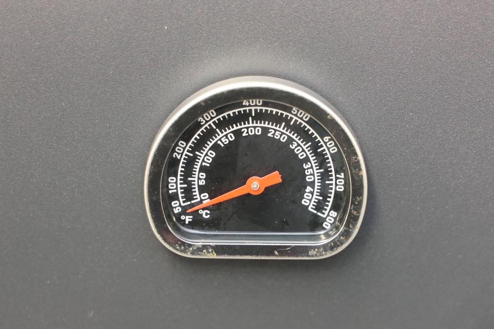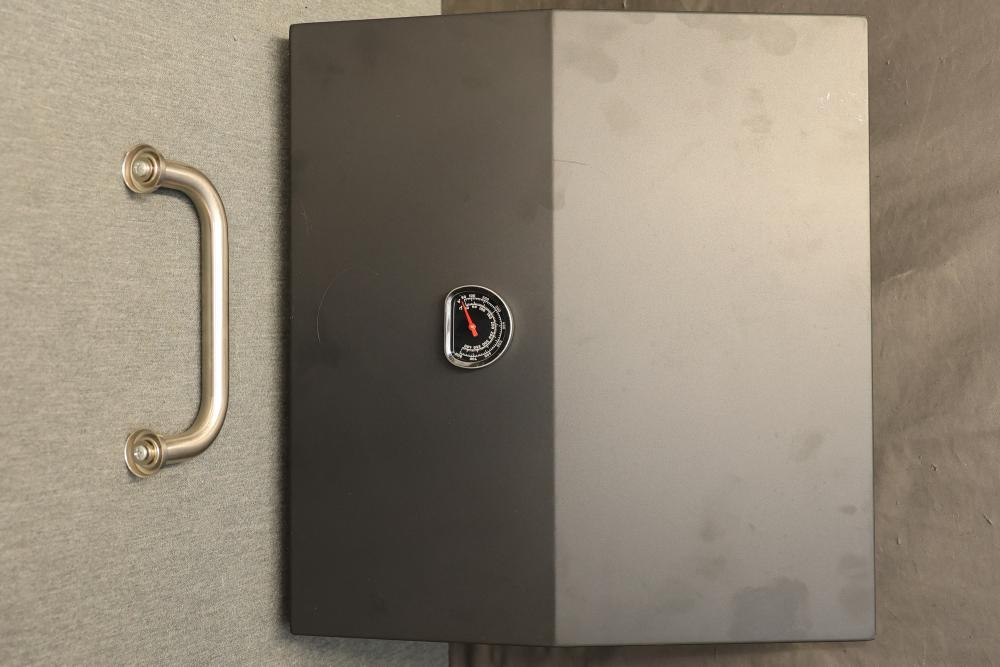 PETKAO Black Stone Hard Cover Lid for 17 Inch Grill with Handle. This item includes a built-in thermometer and a removable handle. It has signs of previous use, including some visible rust and wear. Pickup only.