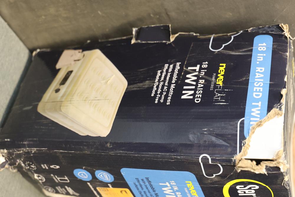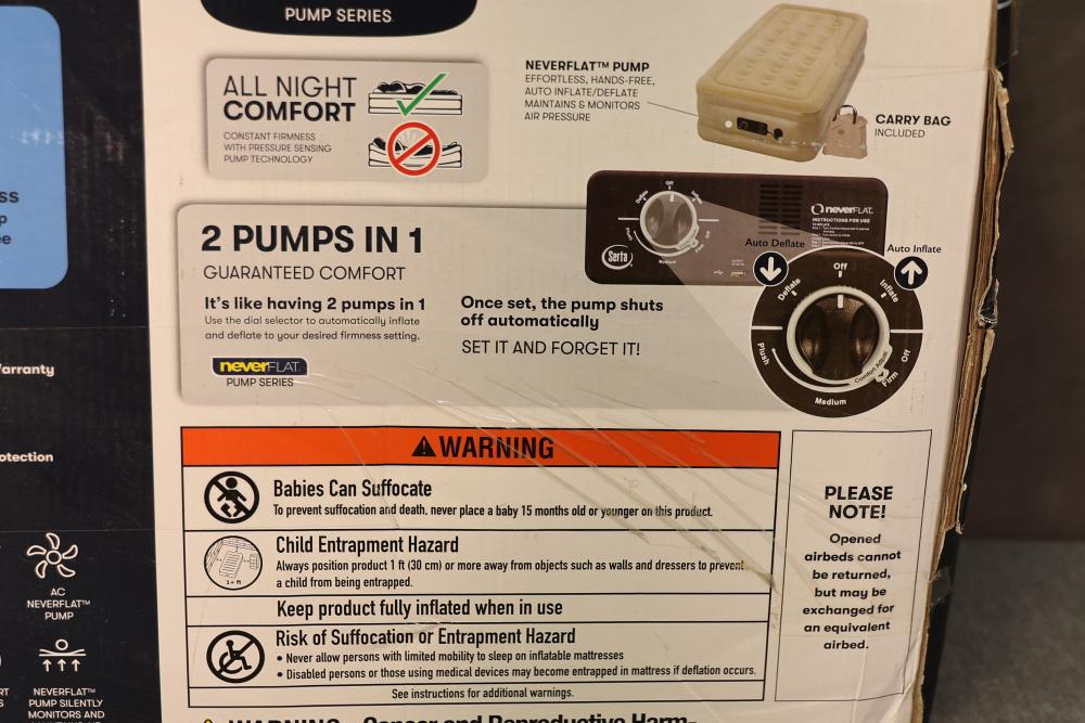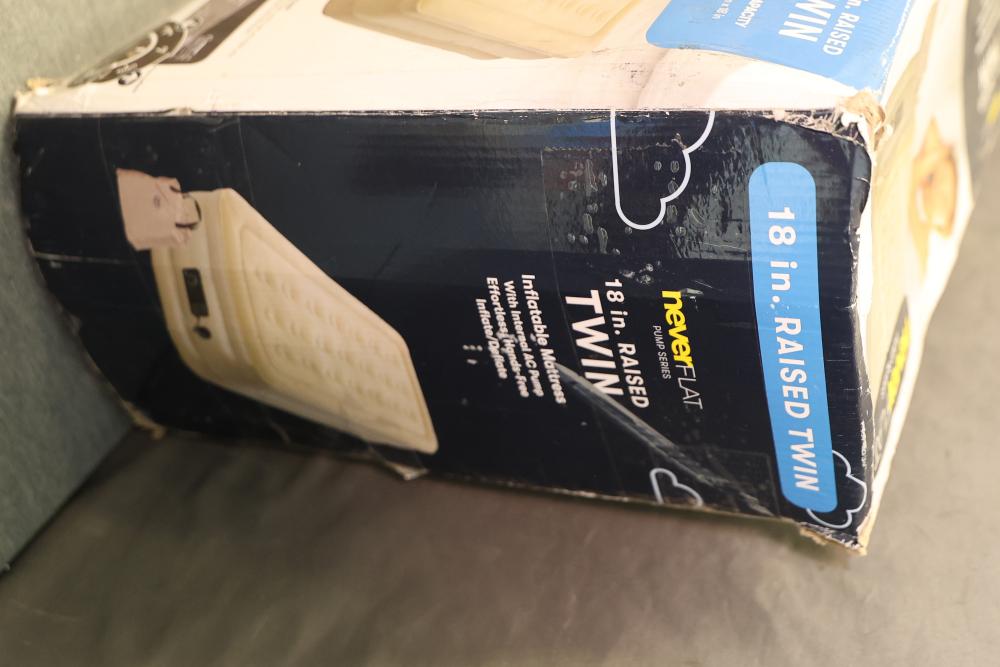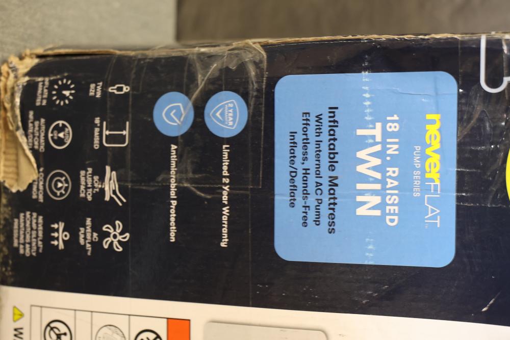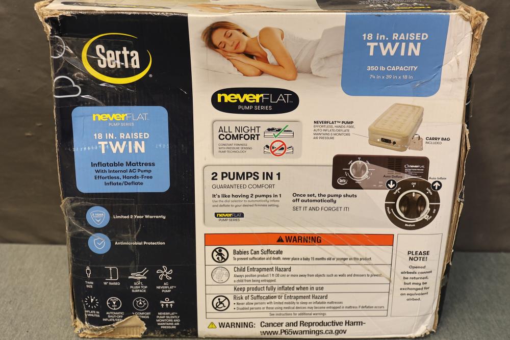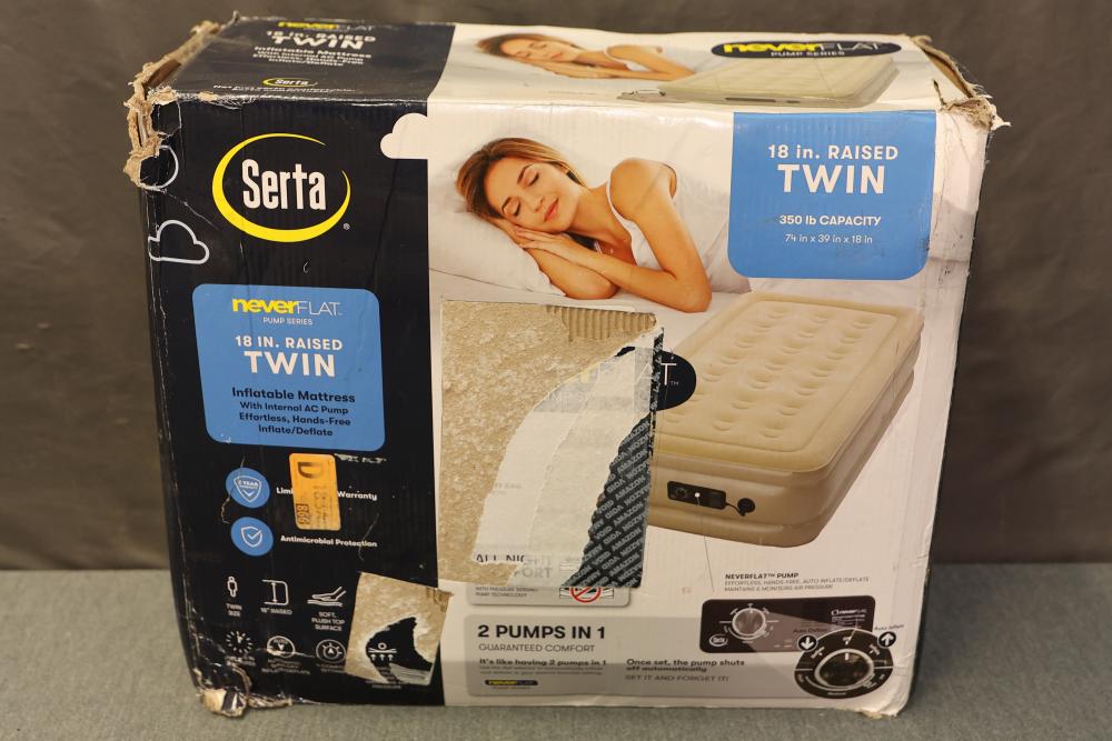 Serta 18 Inch Raised Twin Inflatable Mattress with Internal AC Pump. Features NeverFlat pump series with effortless hands-free inflate/deflate system and a limited 2-year warranty. Provides antimicrobial protection and accommodates up to 350 lbs. Dimensions are 74 in x 39 in x 18 in. Packaging shows signs of wear. Pickup only.