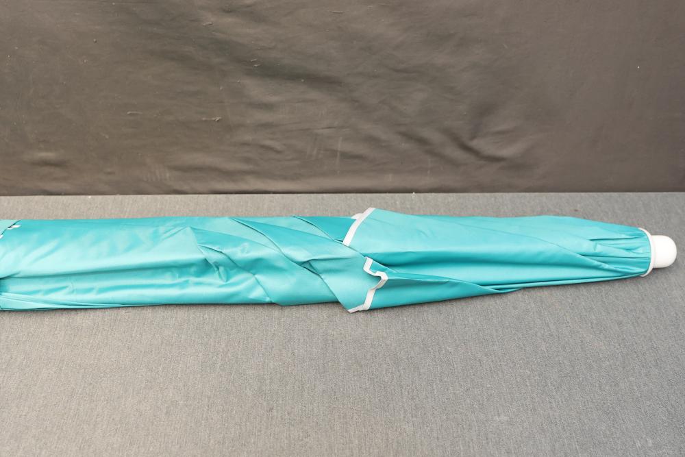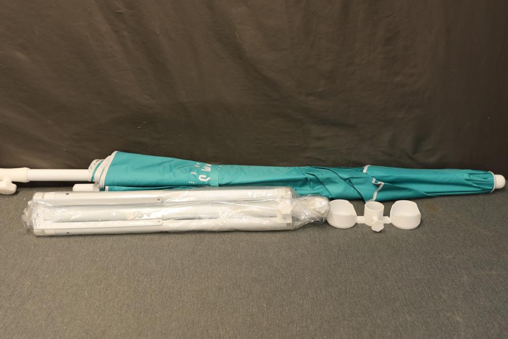 Ammsun Portable Shade Turquoise Umbrella with Stand, 6.5 feet high. Includes a turquoise umbrella with adjustable height, a sturdy stand, and added accessories for stability and convenience. Suitable for outdoor use. Pickup only.