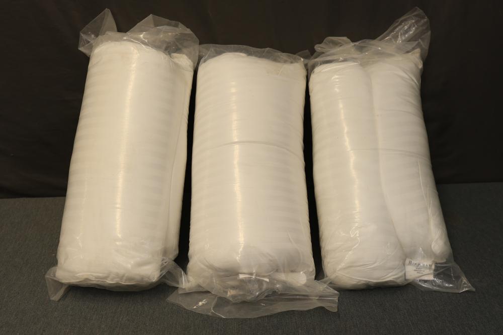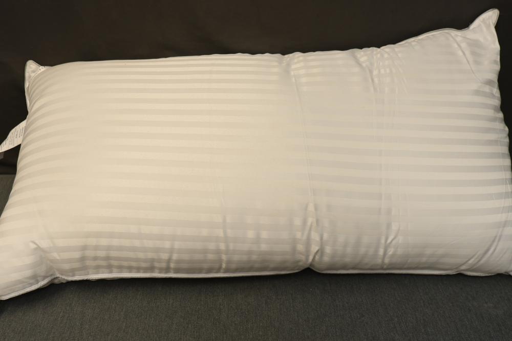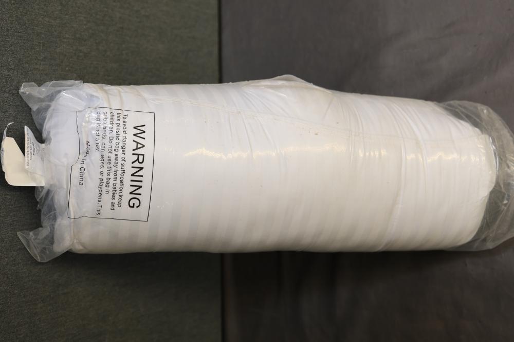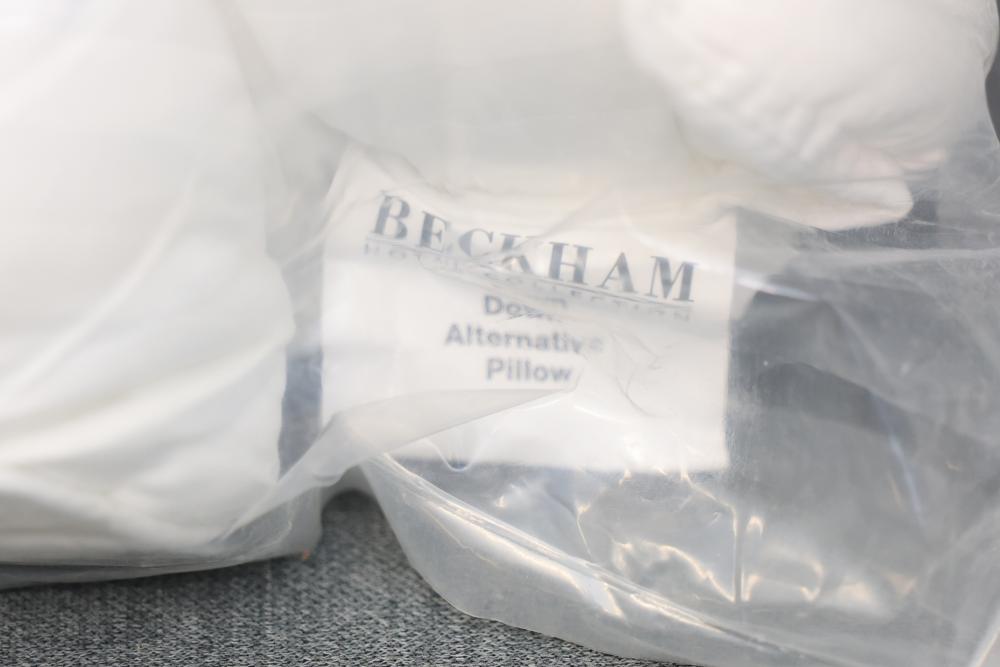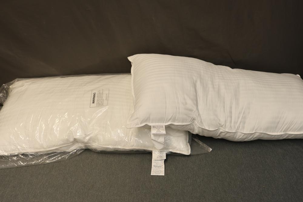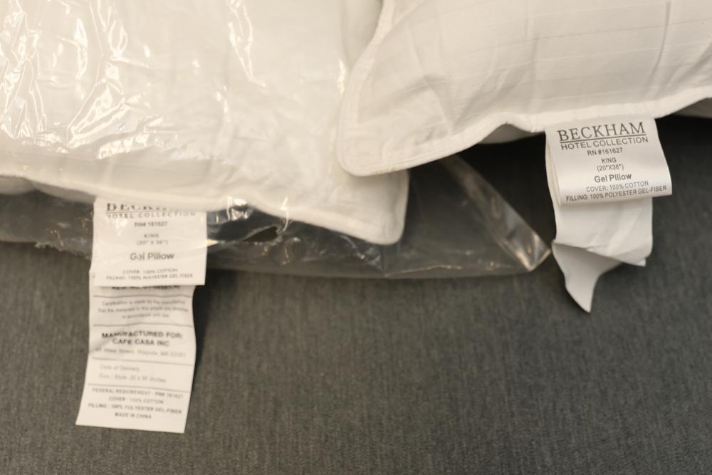 Bedding Package Featuring Pillows, Memory Foam Topper, Portable Foam Pad, and Storage Bags. Includes 2 Beckham Hotel Collection Gel Pillows in King Size (1 not in packaging), 1 Oeko-Tex Standard 100 Pillow(not in packaging), 3 Beckham Hotel Collection Down Alternative Pillows, 1 Beckham Hotel Collection Gel Pillow in Queen Size, 1 Perlecare 4-Inch Memory Foam Mattress Topper in Purple, 1 Contour Legacy Leg and Knee Memory Foam Side Sleeper Support Pillow (not in packaging), 1 Pack and Play Tri-Fold Portable Foam Pad (not in packaging), and 1 Package of Vacuum Bags for Bedding Storage size 100 cm by 130 cm. Pickup only.
