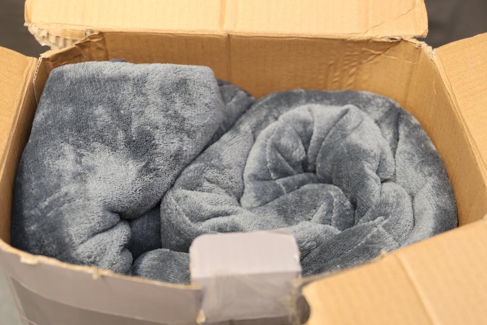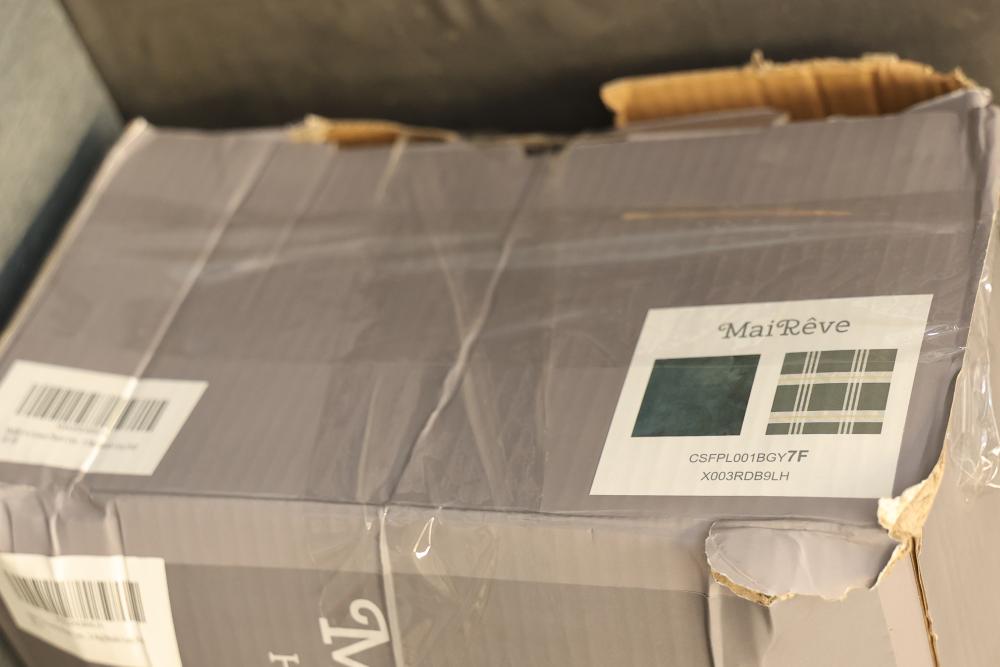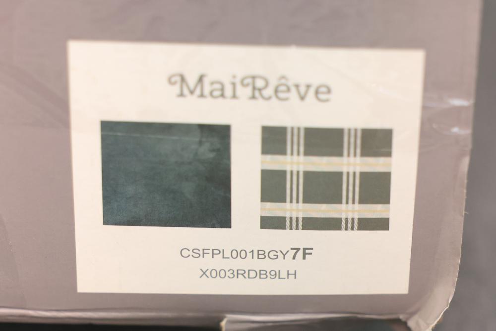 Mai Reve Full Size Comforter Set in Bluish Gray. Includes a comforter designed to fit a full-size bed. The set is in its original packaging, though the box shows visible signs of wear. Pickup only.
