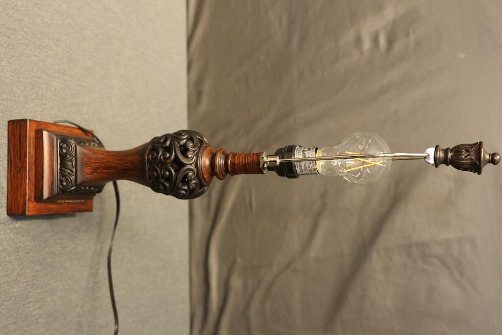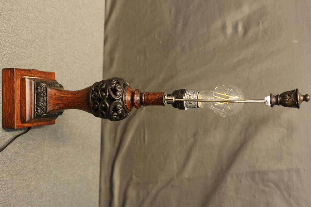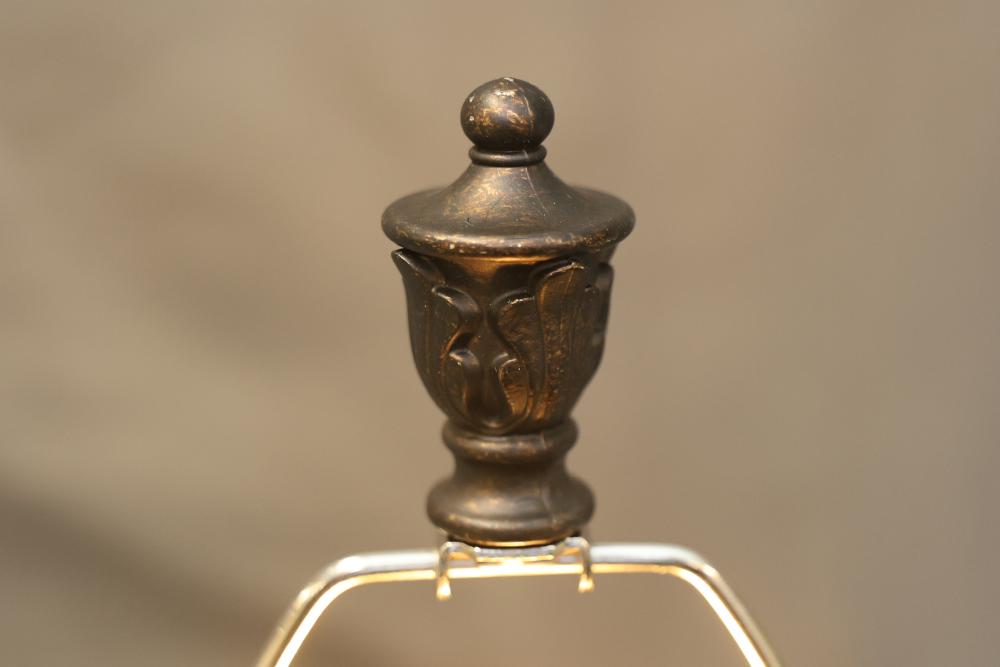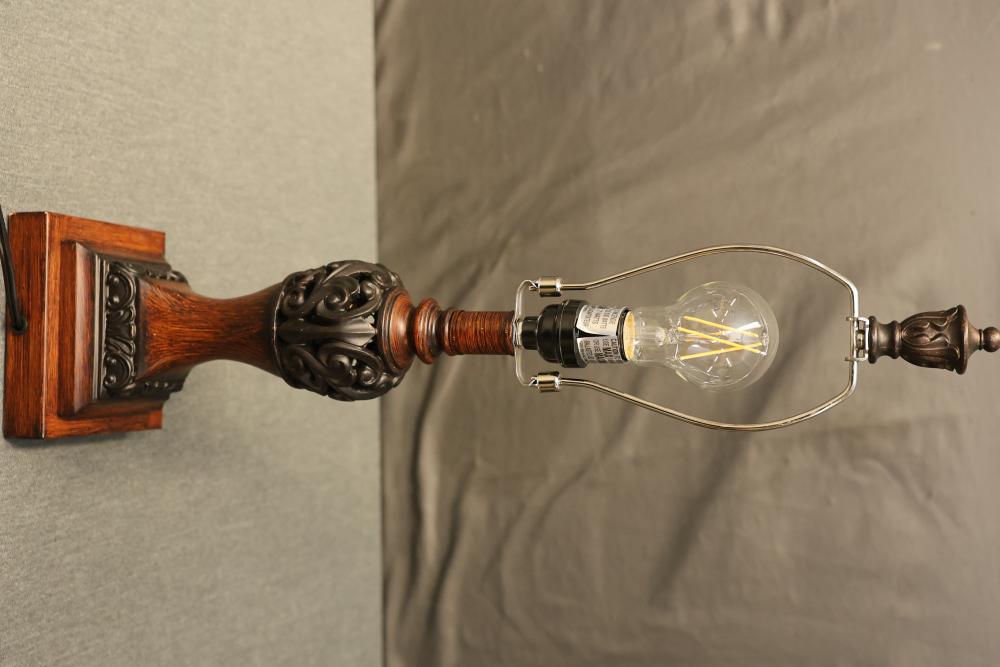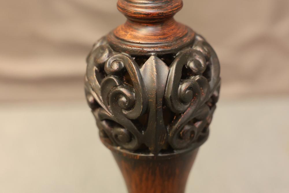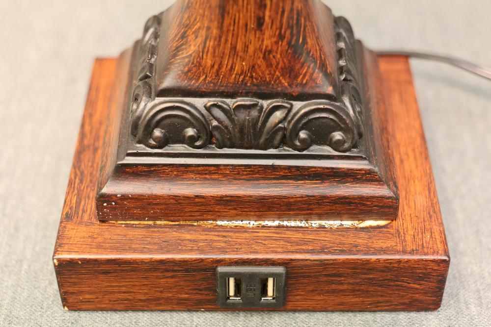 Wooden Tiffany-Style Table Lamp in Dark Bronze Finish with Victorian-Style Base containing 2 USB Ports. Measures approximately 23 inches high. Pickup only.