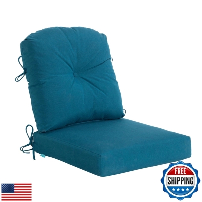 Qilloway TZB15 Outdoor Seat Cushion Set of 2 in Peacock Blue. Includes two cushions, each featuring a peacock blue fabric. The set comes in its original sealed packaging. Model number is TZB15. Dimensions of the box are approximately 42 x 21 x 20 inches. Pickup only.