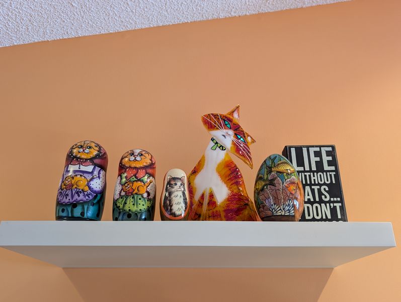 Collectibles International Décor. Five Nyform hand-made Norwegian troll dolls, ea. approx. (see photos for pricing); assort décor and dolls from various travels, incl three wood puzzles. See photos for more details. Shelves not incl.
