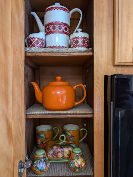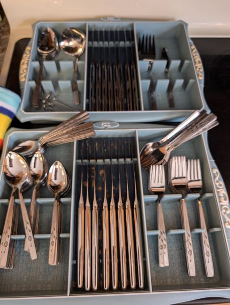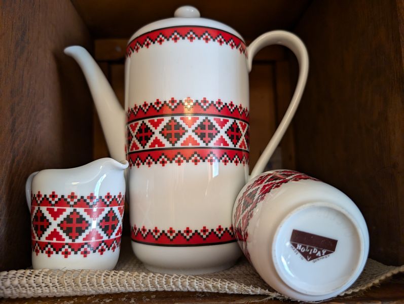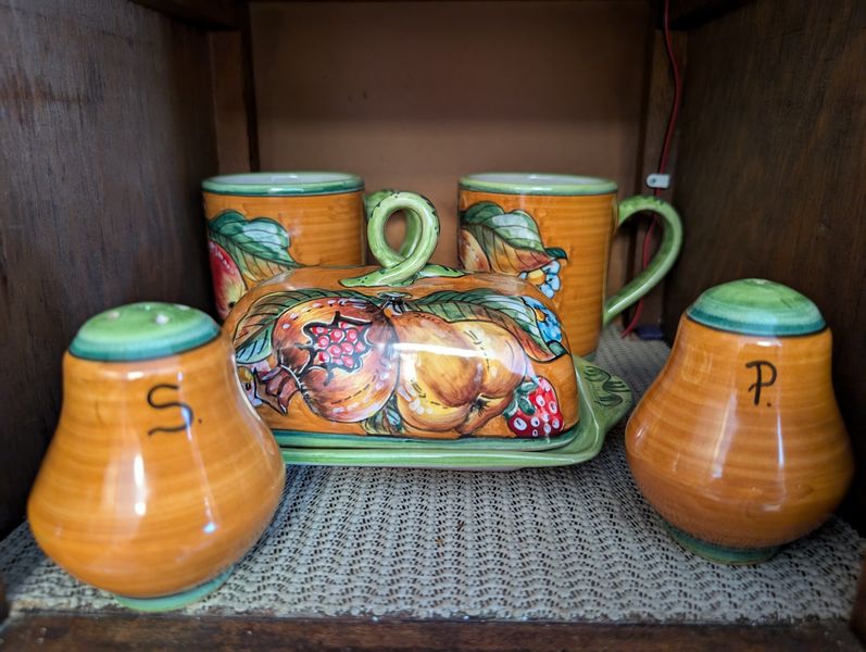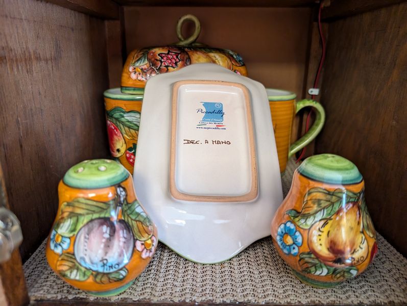 Kitchen Entertaining, featuring Italy and Germany. Kitchen ent: 5-pc German coffee set; covered New Amsterdam tea pot; Tuscan décor, 12-pcs, incl lg bowl, 13"diam; Oneida craft stainless flatware sets (2 sets/serve 8, mostly complete) with hostess pcs; other entertaining items as seen in photos.