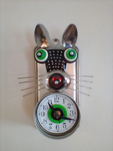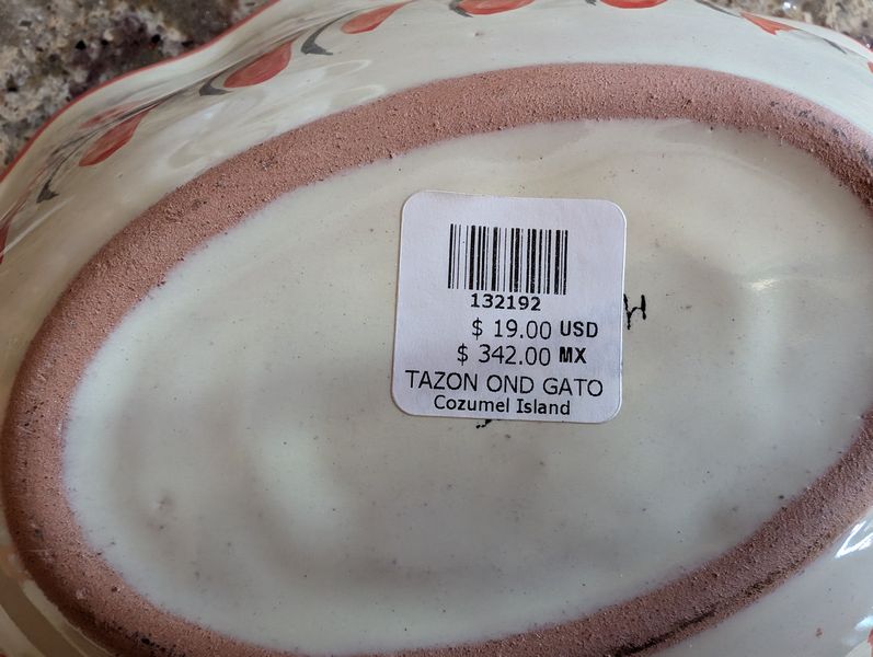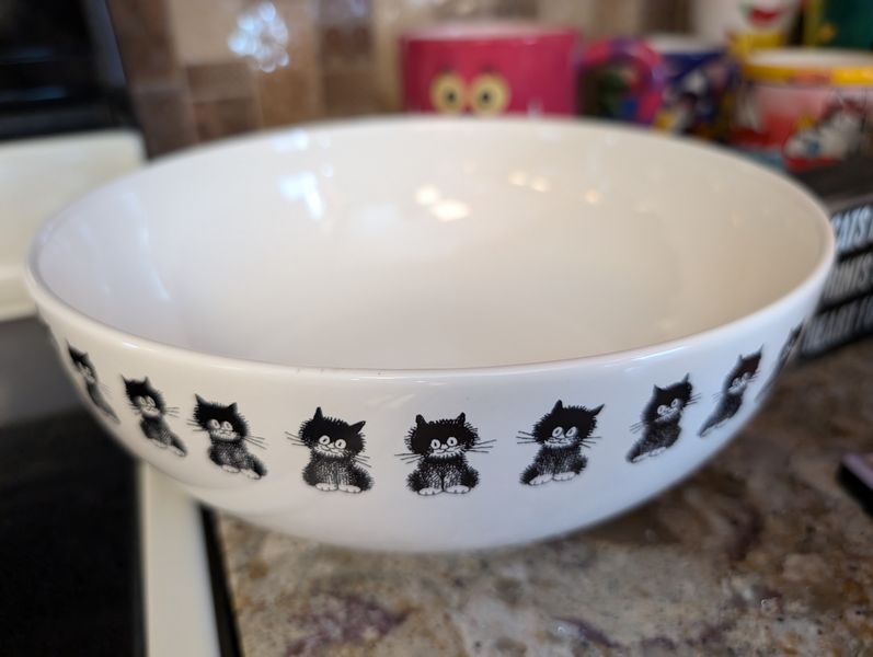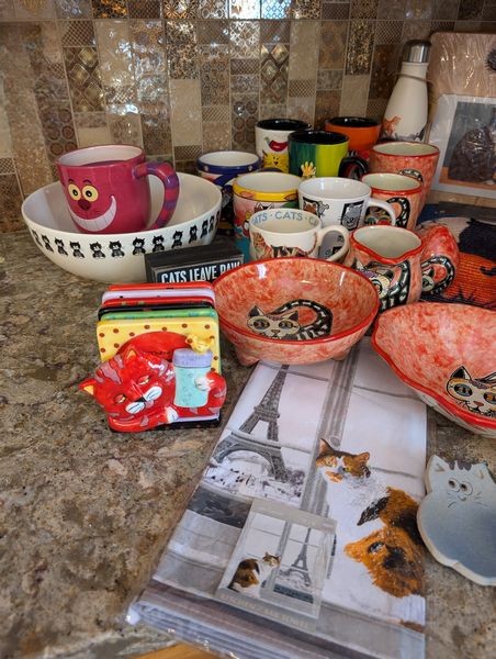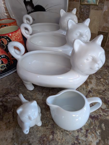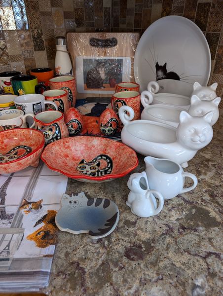 Cat-Motif Kitchen Entertaining. Nine pcs Tazon Ond Gata, oval bowl 9"L; three Pier 1 cat vessels; lg bowl, 10"diam; cat wall clock (made of loaf pan & spoons); other related items as seen in photos on kitchen counter (right of stove).