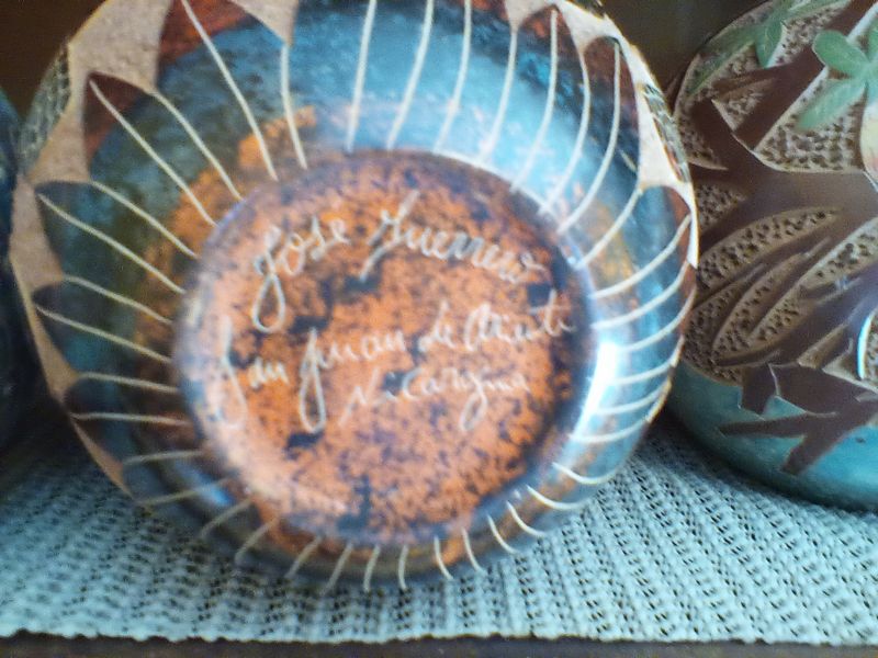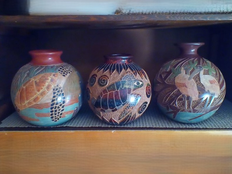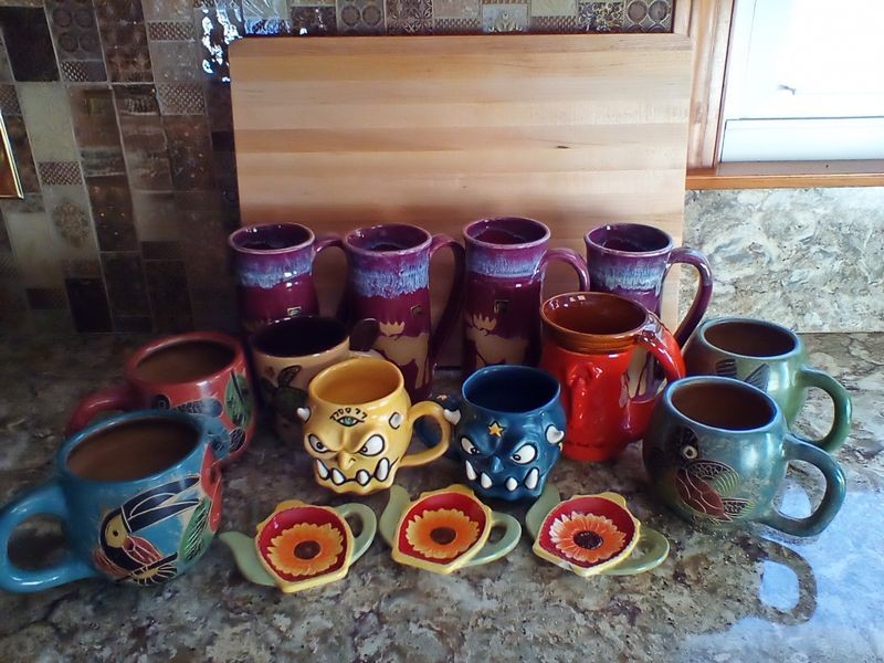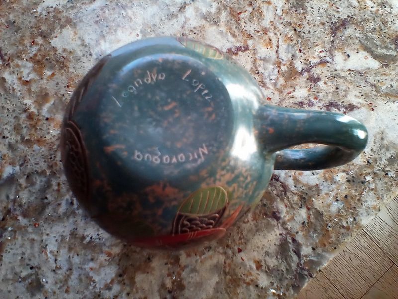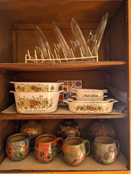 Corning Cookware, Pottery. Eleven pcs La Marjolaine corning bakeware & covers; three hand-painted vases (see photos & markings); six Nicaragua handled mugs (see markings); Alaska mug, 7".