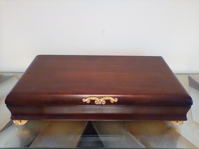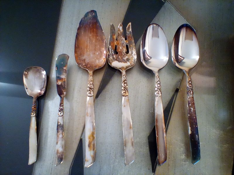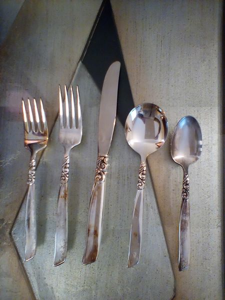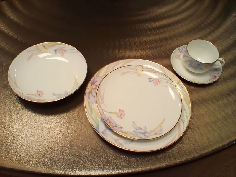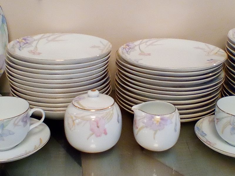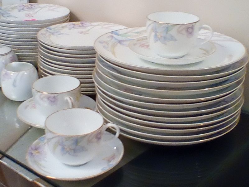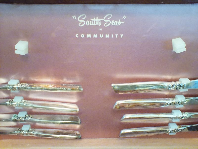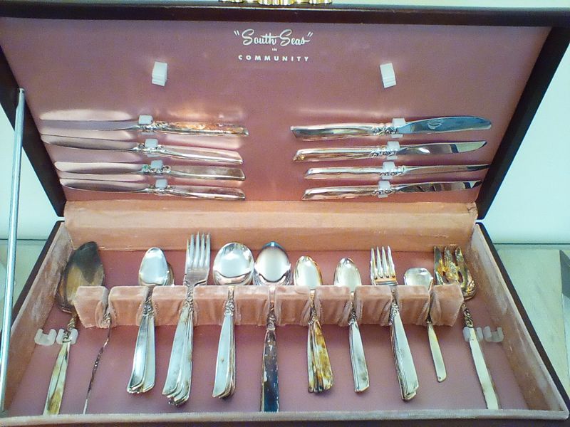 Mikasa Dish and Community Flatware. Five-pc, serv/12 Mikasa "Gabrielle" dish set with hostess pcs; five-pc, community "South Seas" flatware with six hostess pcs (26 pcs total, missing one dessert fork) in a wood chest.