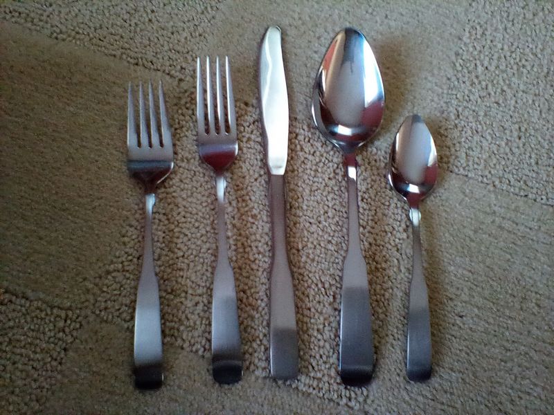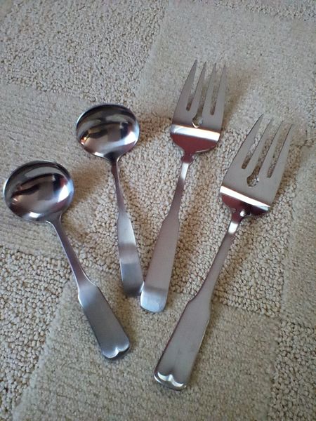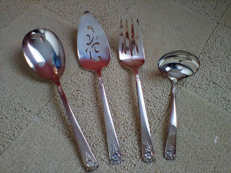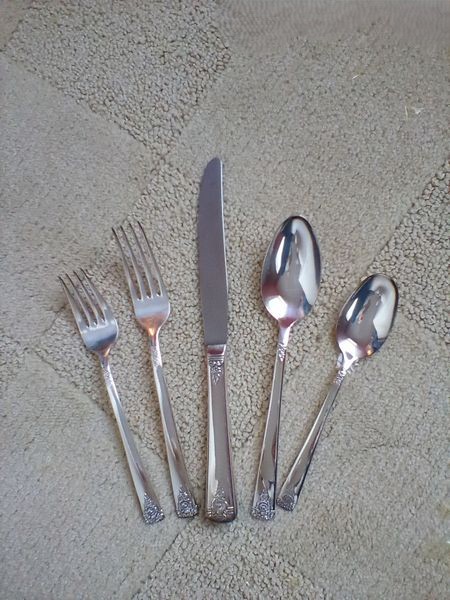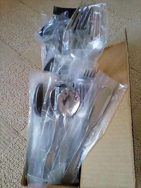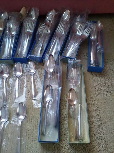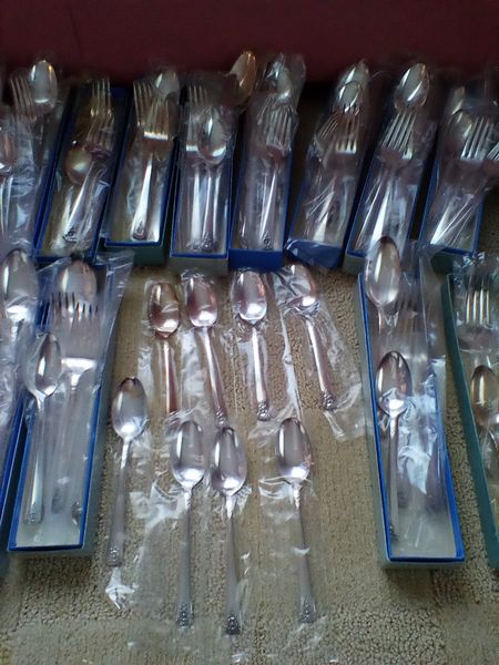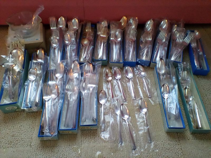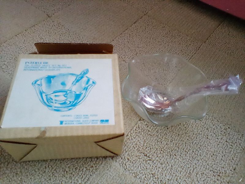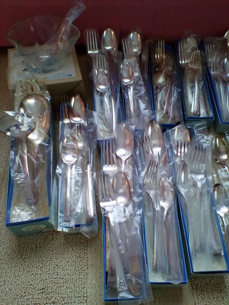 Flatware Sets and Condiment Dish. Two unused sets: Wm Rogers reinforced plate, 5-pc flatware sets, serv/16 (14 complete sets same pattern, in original packaging, missing two dessert forks) with hostess pcs and additional spoons; International stainless flatware: 5-pc, serv/8 with hostess pcs (original packaging, made in Taiwan).