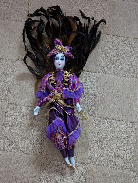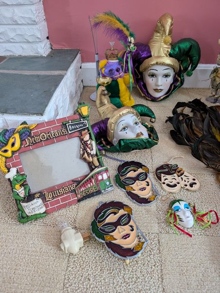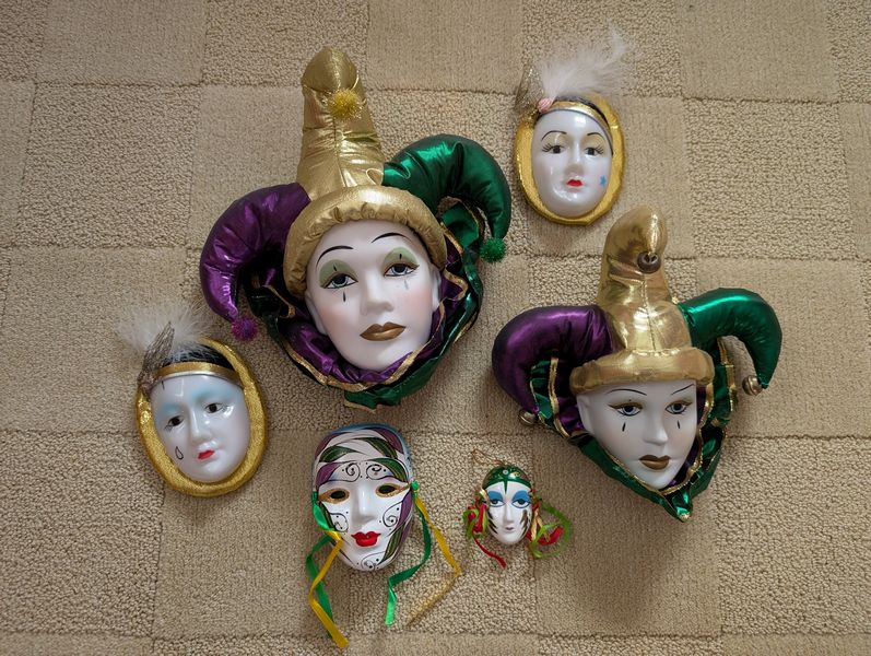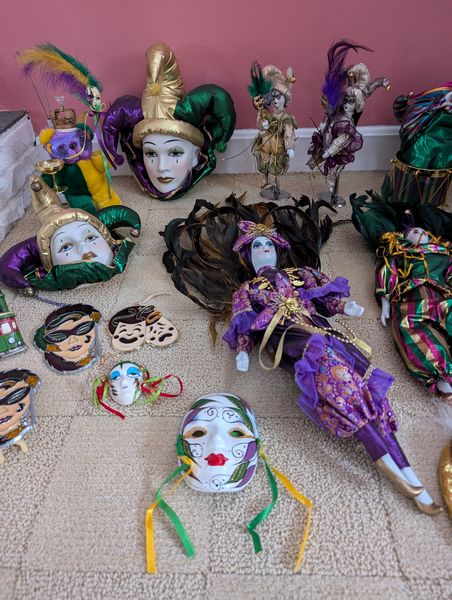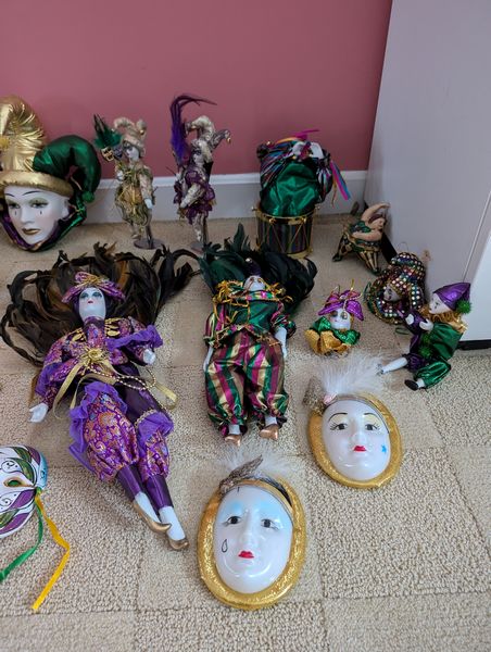 Masquerade Wall Décor. Approx 20 pcs, incl largest doll, 22"H. Also incl: music box; masks; dolls; ornaments. See photos for details.