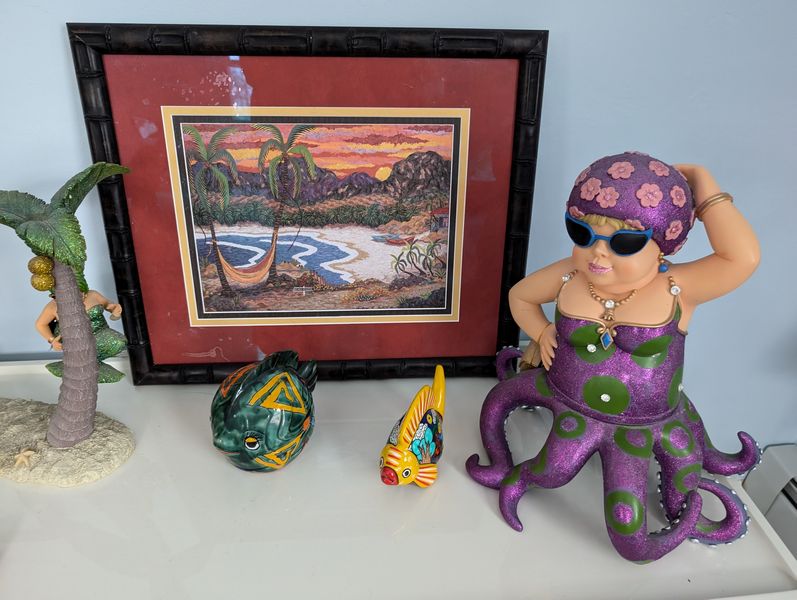 Beach Décor and Long Cabinet. Multi-functional white cab, 63"Wx17"Dx20"H (matches pcs in lots #41, 49); wall décor, incl destressed wood "Beach" sign, 44"Wx16"Hx2"thick; lg whimsical mermaid figures; other beach décor & wall art as seen in photos. Loc on 2nd floor. Bring help to navigate lg cabinet.