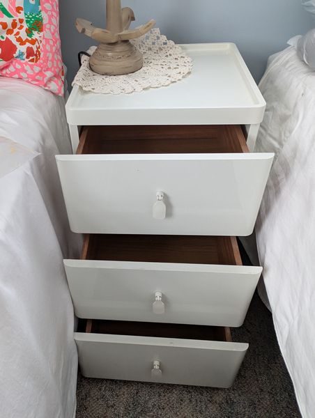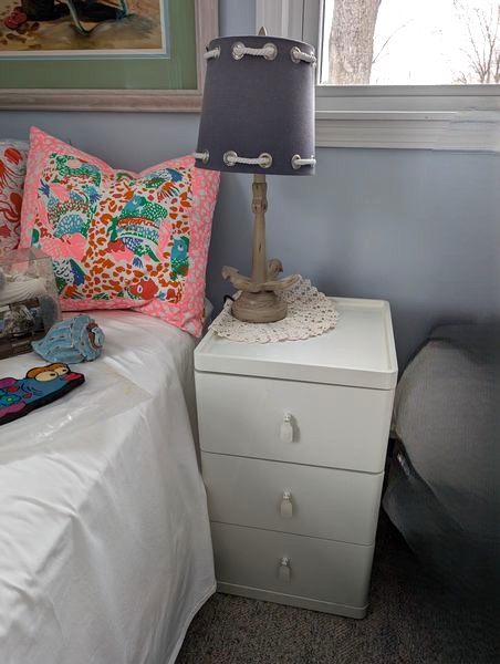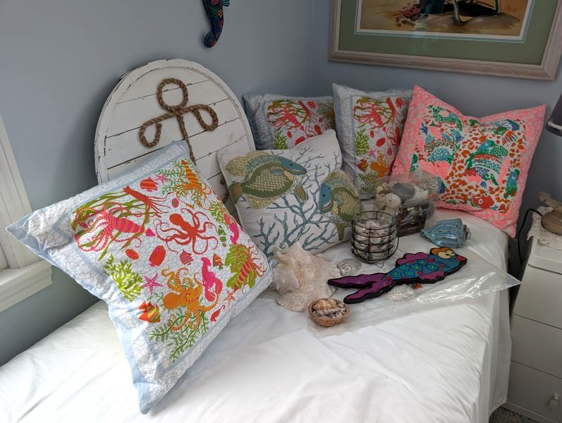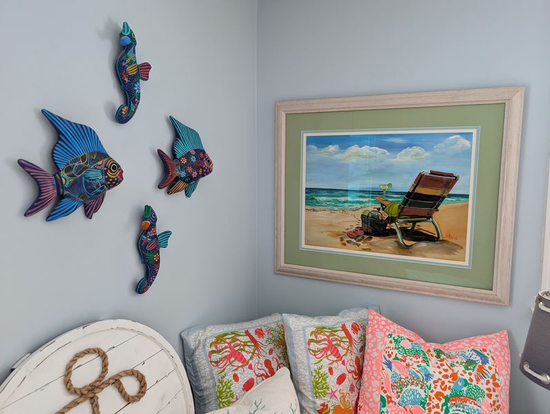 Beach Décor and Small Cabinet. Signed & framed beach motif print, triple-matted, behind glass, 35"Wx29"H; three-drawer white side cab (matches pcs in lots #40, 49), 15.5"sq x26"H; (5) colorful throw pillows, ea. approx. 15"sq; fish décor; shells. See photos for more details. Bed seen in photos not incl. Loc on 2nd floor.