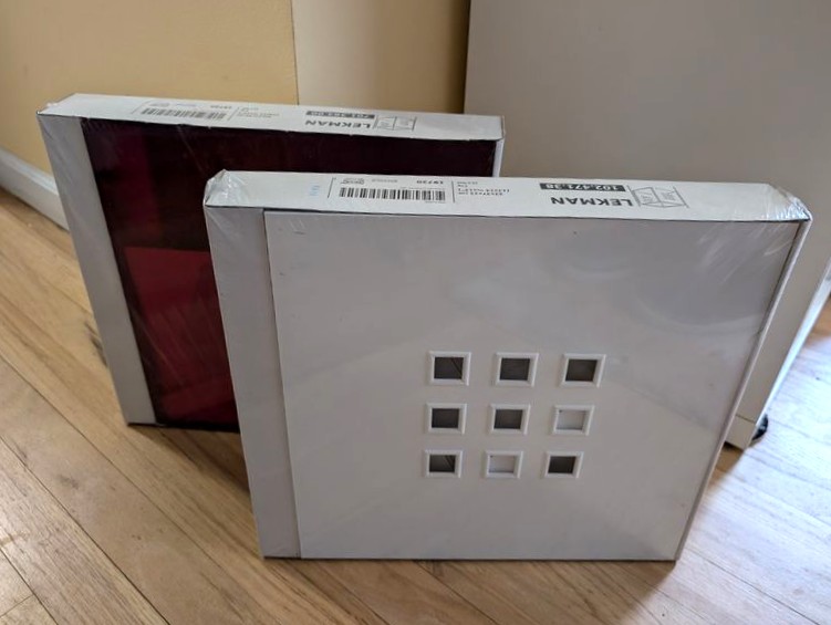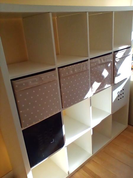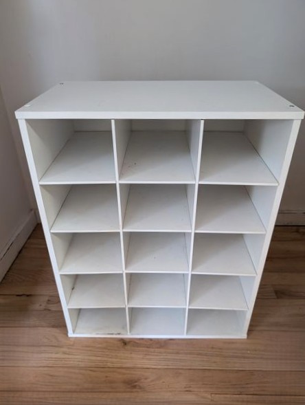 Cubby Storage. White 16 cubby unit, 58"sq x15"D with four fabric and two acrylic storage container (2 new); white shoe storage. Loc on 2nd floor. May req partial dismantling to remove, bring tools.