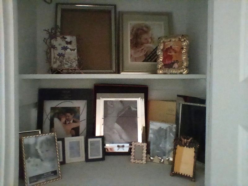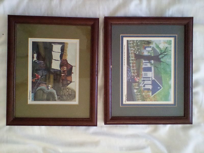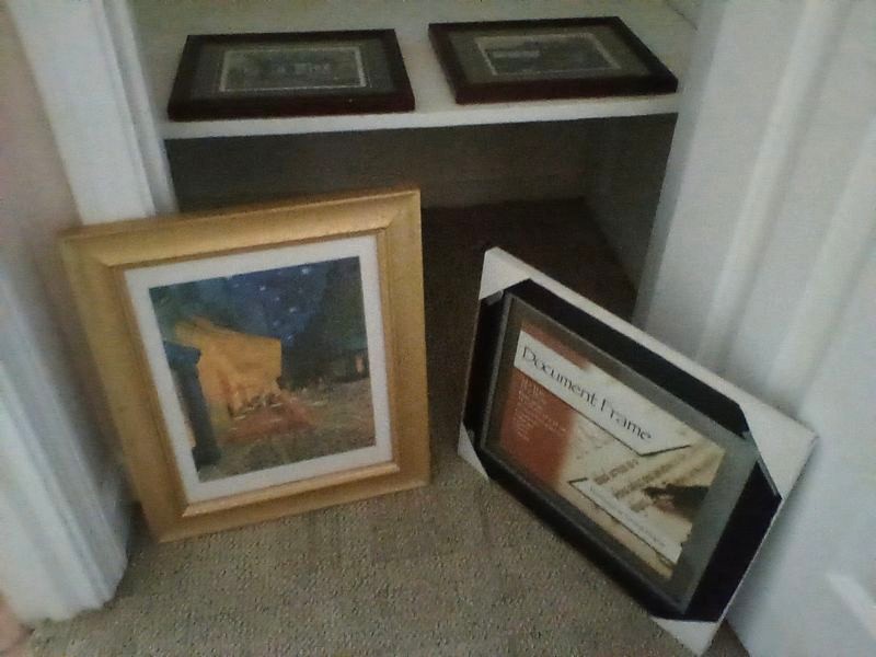 Frames and Signed Wall Art. Over 2-doz frames (assort sizes); two pcs signed Morley wall art in wood frames, double-matted, behind glass. See photos for details. Loc on 2nd floor in closet.