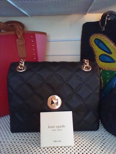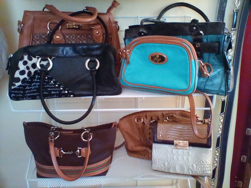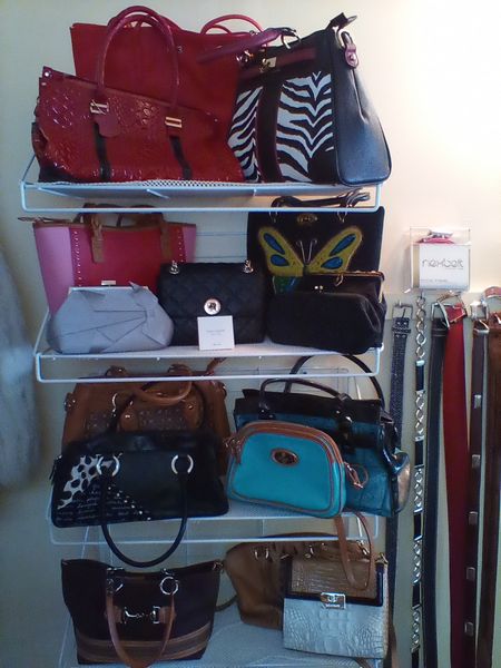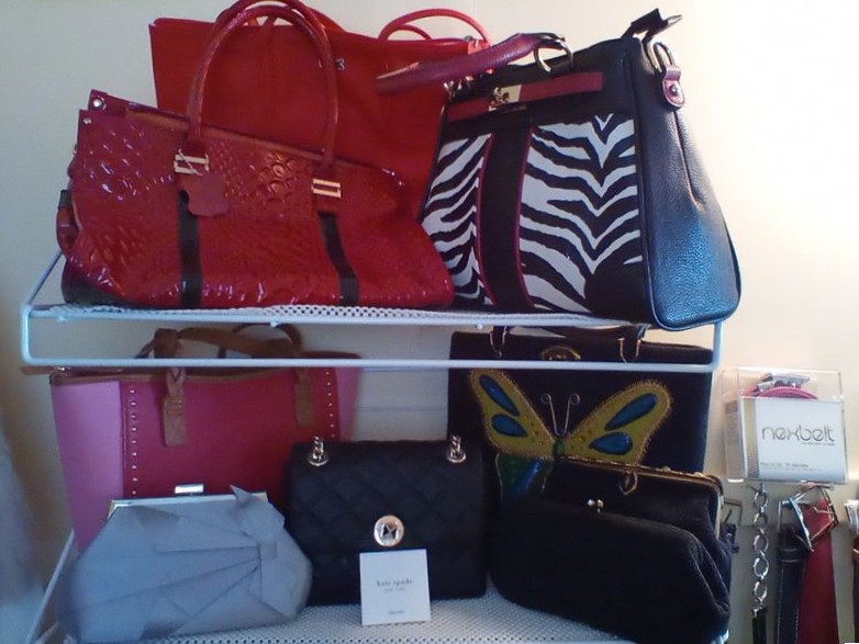Designer Handbags and Belts, featuring Kate Spade, Brahmin, Peruzzi. Fifteen handbags incl: Kate Spade; Brahmin; Peruzzi; two vintage beaded clutches; brown striped bag from Spain; red tote by LaCoste; black zebra print by Stacey Whitmore; two Next belts (pink, black); eight other assort belts (see photos for details); Loc on 2nd floor in walk-in closet (right wall).