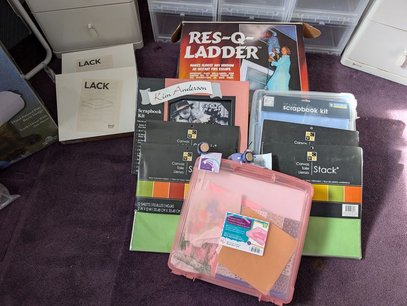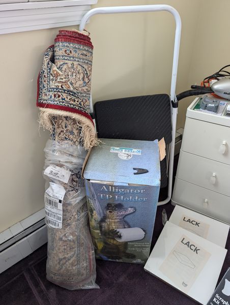 Household Functional, featuring Shoe Storage. Eighteen stacking shoe storage containers, overall 34"Wx14"Dx42"H; fringed area rug, approx 3'W (length not known); folding step ladder; pair of three-drawer white nightstands (matches furniture in lots 40, 41, 49); three-drawer white plastic storage; (four) fringed blankets; whimsical toilet paper holder (boxed); assorted wall decor; electronics (radios, etc); Nikon binoculars in case; other related items as seen in photos. Located on the second floor.