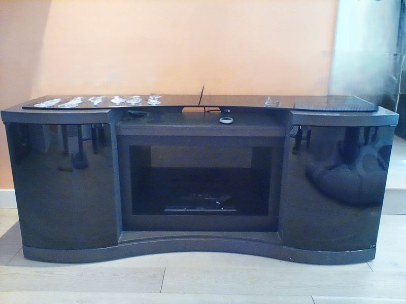 TV Entertainment Center with Built-In Heating Element. Modern black ent center by CDimplex, 6'Wx21"Dx31"H with glass top (items seen on surf not incl), left & right storage with glass door and interior shelves. See photos heating element, model #, other details. Working condition not known. Items seen in background and on top not incl.