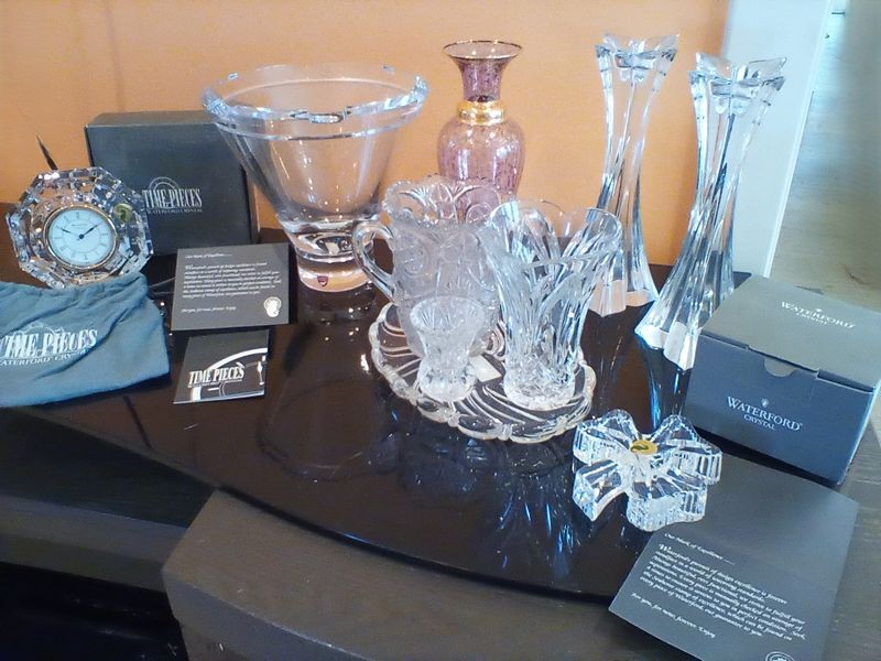 Fine Crystal and Glass Entertaining, featuring Waterford and Oneida. Two Waterford pieces including octagonal "The Pieces" crystal clock (new in box); crystal shamrock decor (new in box); modern crystal Orrefors bowl or vase, 9"diam x8"H; pair of Mikasa candlesticks, ea. 10"H; Mikasa tray; other related items as seen in photos.