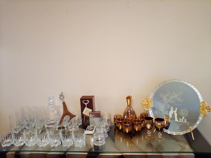 Bar Glasses and Entertaining Pieces. Seven-pc colored glass decanter set with gold embellishments; pr Italian Venetian Bohemian ruby-colored glass goblets; decorative mirrored tray with gilt handles, 14"diam; monogrammed crystal decanter (see photo); set/7 crystal highball glasses; set/7 tall beverage; other sets of glasses; horn-motif bottle opener; other related items as seen in photos.