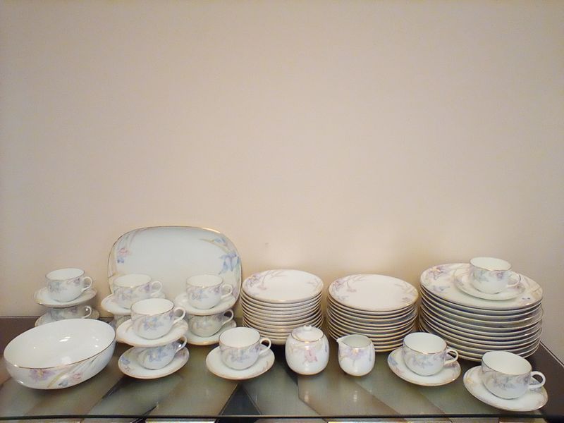Mikasa Dish and Community Flatware. Five-pc, serv/12 Mikasa "Gabrielle" dish set with hostess pcs; five-pc, community "South Seas" flatware with six hostess pcs (26 pcs total, missing one dessert fork) in a wood chest.
