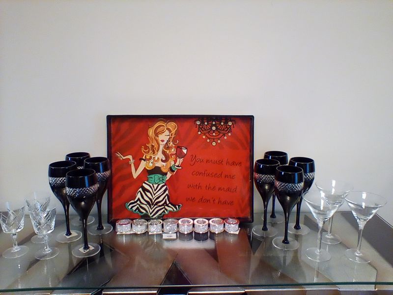 Waterford Hungarian Signed Stemware. Set/8 black Waterford lead crystal wine glasses by John Rocha; sets/3 crystal etches stemware; set/3 martini glasses; set/8 unused decorative napkin rings; whimsical serv tray, 19"x14".