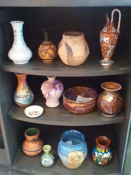 Pottery Vases and Vessels. Items from various travels. Approx 20 pcs. Two figures in center, back have detached arms (clean break). See photos for details and maker's marks.