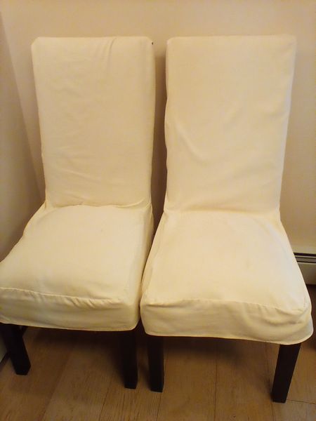 Set of Eight Parson's Chairs. Eight light cream textured Parson's chairs, ea. 18"Xx19"Dx43"H with slip covers for all (covers req cleaning, chairs in very good condition). Believed to be made by Lexington Furniture.