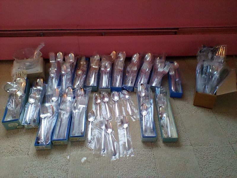 Flatware Sets and Condiment Dish. Two unused sets: Wm Rogers reinforced plate, 5-pc flatware sets, serv/16 (14 complete sets same pattern, in original packaging, missing two dessert forks) with hostess pcs and additional spoons; International stainless flatware: 5-pc, serv/8 with hostess pcs (original packaging, made in Taiwan).
