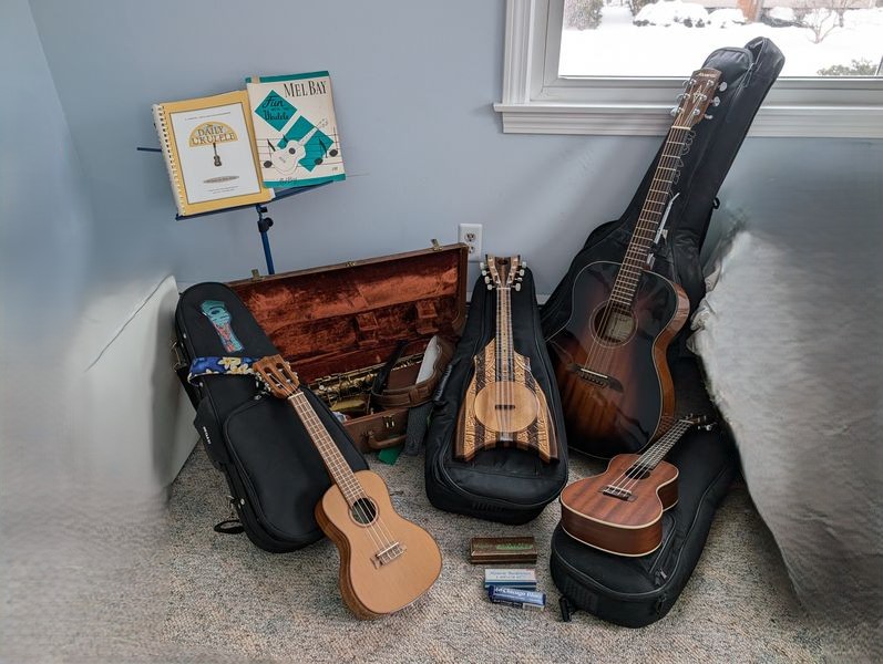 Musical Instruments. Three Ukuleles with soft travel cases; Alvarez guitar with soft travel case; brass saxophone in hard case; three harmonicas (boxed); music stand; music books. See photos for more details.