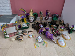 Masquerade Wall Décor. Approx 20 pcs, incl largest doll, 22"H. Also incl: music box; masks; dolls; ornaments. See photos for details.