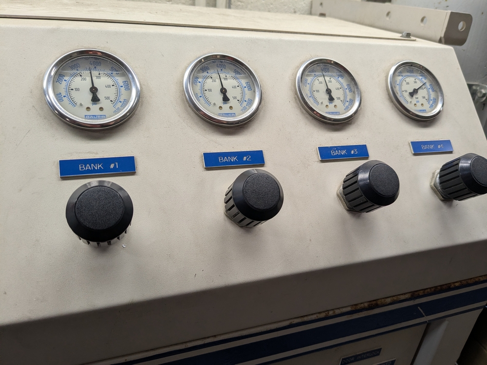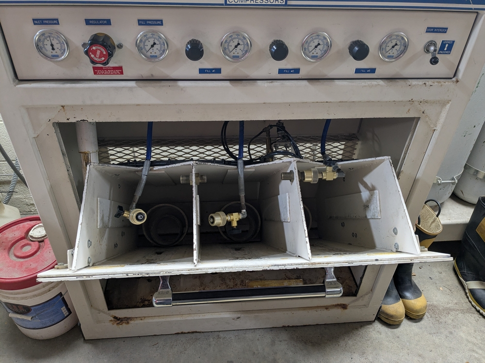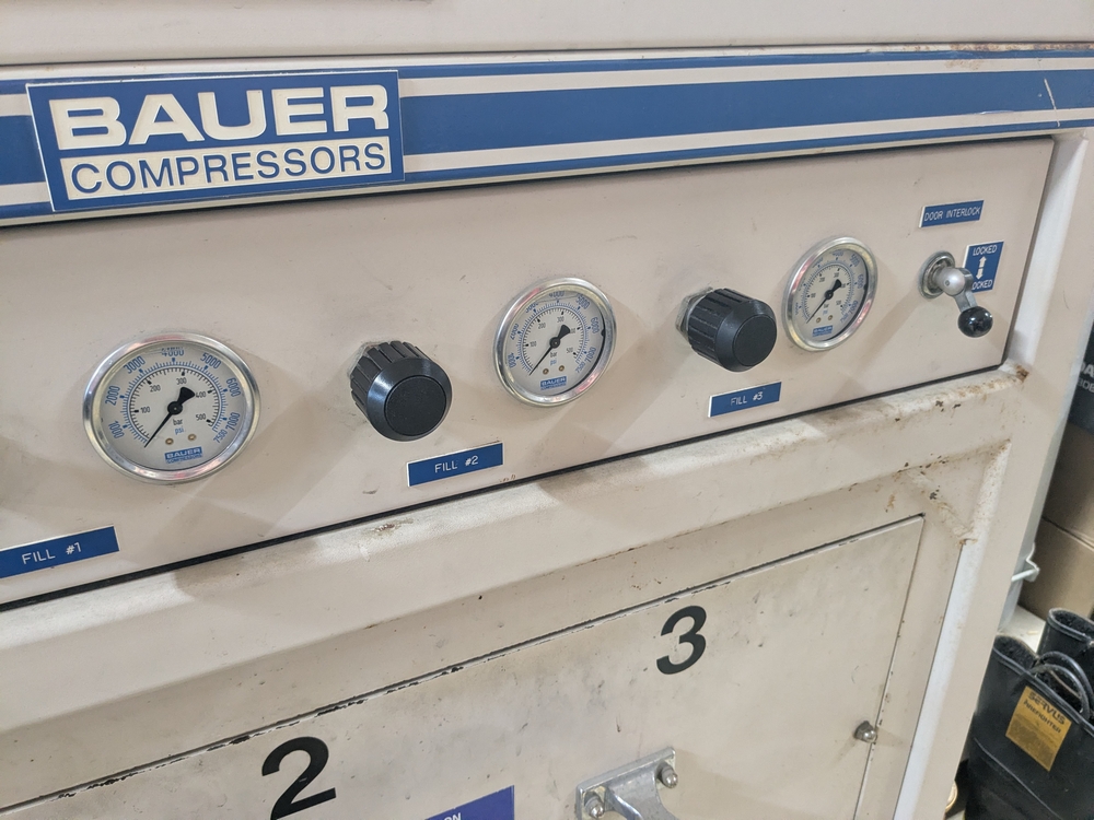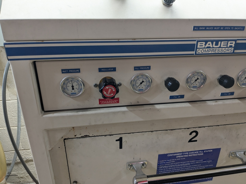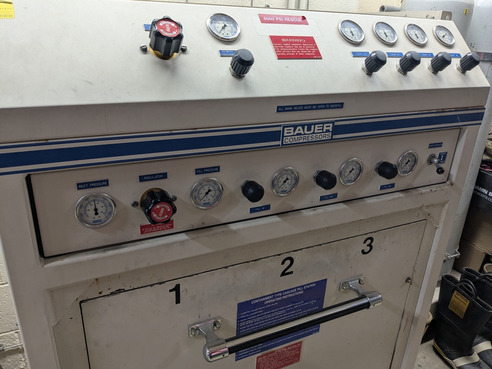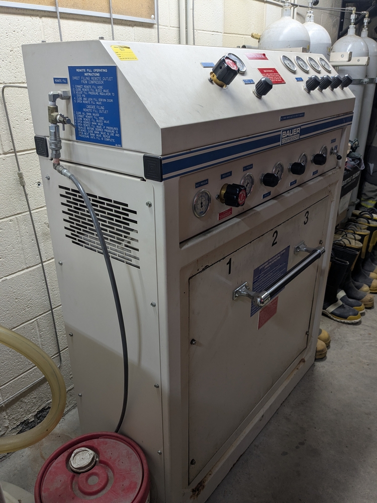 Items include 2003 Bauer H13-E3 high pressure breathing air compressor; 2003 Bauer three-position containment fill station; Roto-Jet fire hose washer w/ hose reel; Stihl 036 Pro chain saw; assorted fire hose fittings; 5" fire hose & more. Items are located in Lowville, NY.