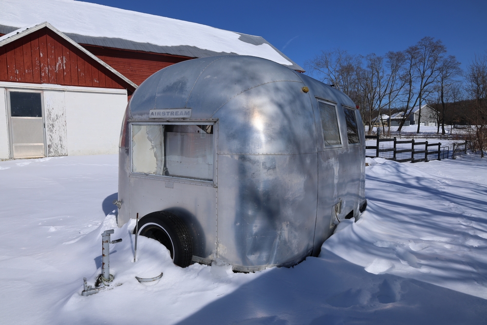 An Airstream Caravel single-axle travel trailer with aluminum body, exterior Airstream and Caravel badging, multiple side windows, front and rear windows, and a front hitch assembly, with the VIN shown on the data plate as J0175579. Snow will be cleared to machine prior to pickup. No equipment is onsite to assist loading. Bring the proper tools, equipment, and help needed to load your items. Bill of sale only.