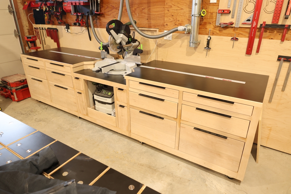 Festool KS 120 REB sliding compound miter saw paired with a Festool CT 15 E HEPA dust extractor, mounted in a custom-built woodworking workstation with integrated cabinetry and work surfaces. Setup includes the miter saw installed flush into the table with fence extensions, dust collection hose connected, and the CT 15 E extractor housed below in a dedicated pull-out compartment. Branding, model identification, and electrical information are visible on the equipment, and the custom table appears purpose-built to support the saw and dust collection system as shown, on casters. Buyer must take all. Excludes the contents of the drawers. No equipment is onsite to assist loading. Bring the proper tools, equipment, and help needed to load your items. Seller reports: nearly all the powertool (especially Festools) are in fantastic condition, low low use and have been kept in climate controlled garage.