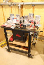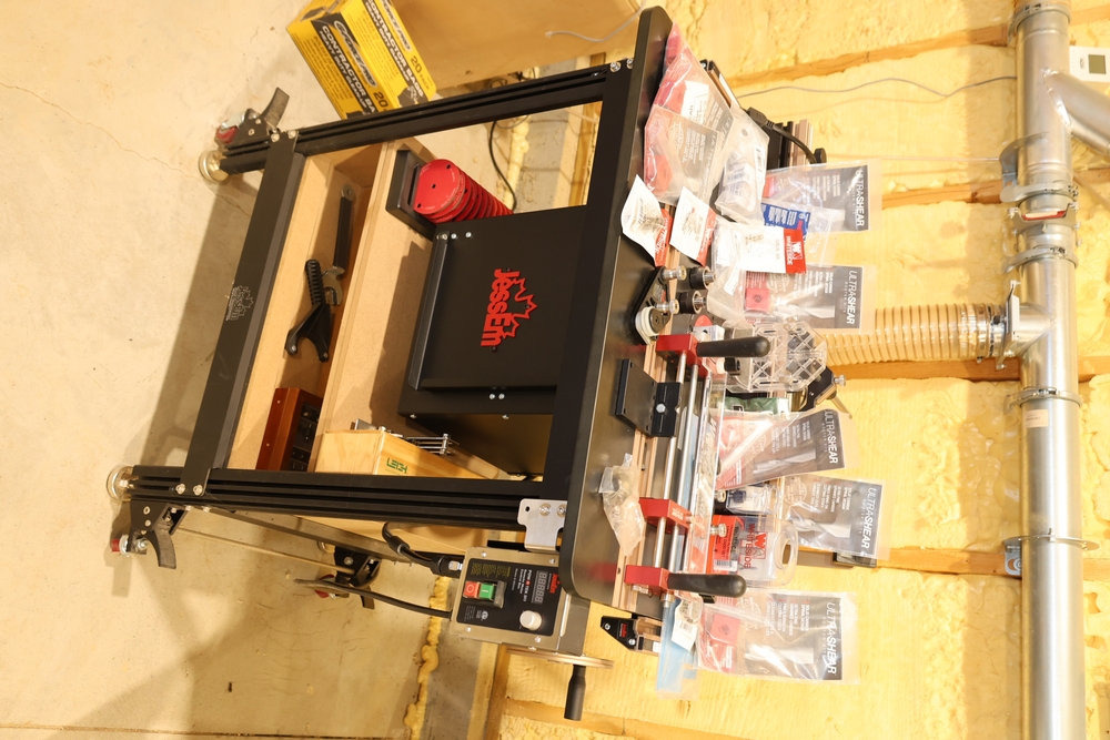 JessEm router table mounted on a wheeled steel stand, equipped with a JessEm fence assembly, clear guard, miter slot, and dust collection port, with a digital readout mounted to the fence. Also included are assorted router accessories and tooling shown, including JessEm and Woodpeckers components, router bits in cases and packaging from manufacturers such as Woodpeckers, Whiteside, Bosch, and Festool, bit storage items, collets, setup tools, and related hardware. Buyer is responsible for removal to the first disconnect. Excludes dust collection ductwork. No equipment is onsite to assist loading. Bring the proper tools, equipment, and help needed to load your items. Seller reports: nearly all the powertool (especially Festools) are in fantastic condition, low low use and have been kept in climate controlled garage.