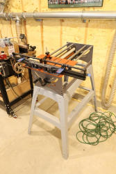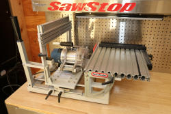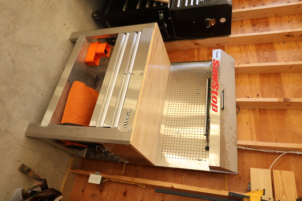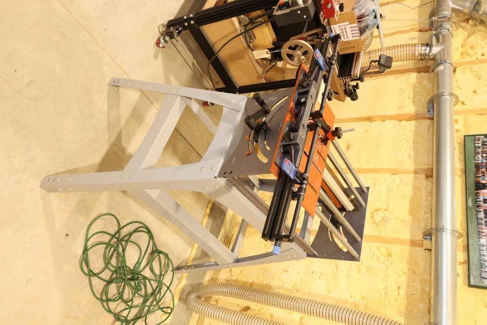 Bridge City Tool Works Jointmaker Pro Signature Series machine, mounted on a freestanding metal stand, featuring anodized aluminum tables, dual fence assemblies with integrated scales, angle adjustment arc, and multiple clamping and positioning components as shown. No equipment is onsite to assist loading. Bring the proper tools, equipment, and help needed to load your items. Seller reports: nearly all the powertool (especially Festools) are in fantastic condition, low low use and have been kept in climate controlled garage.