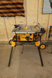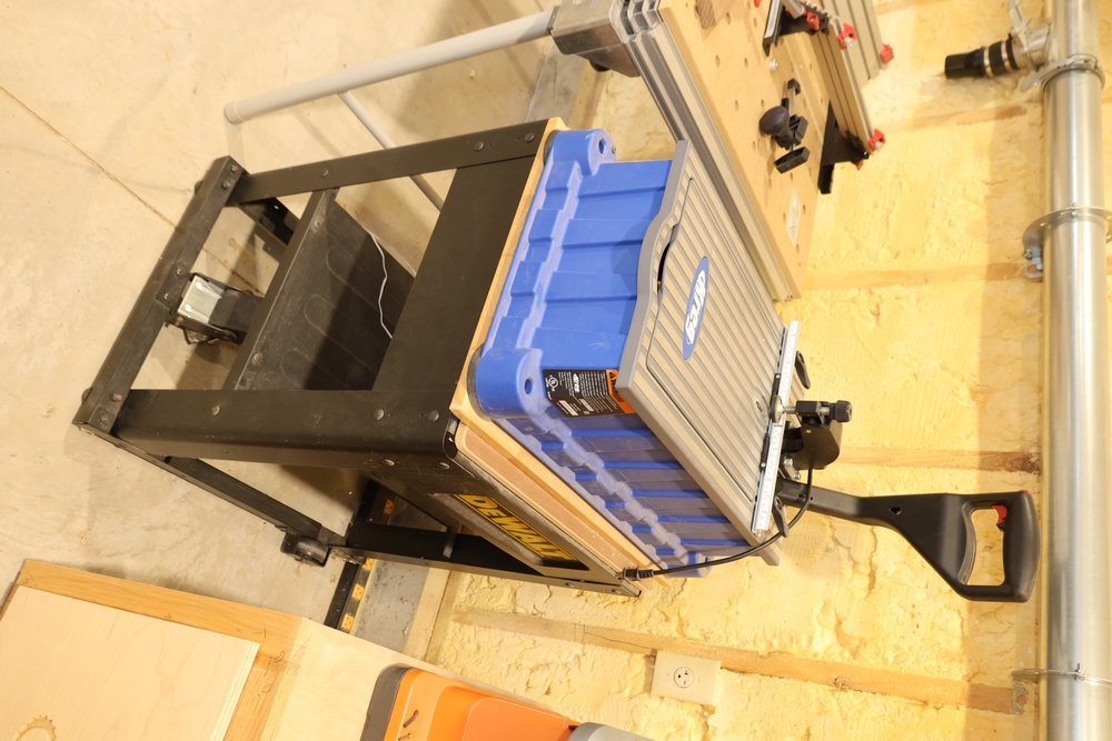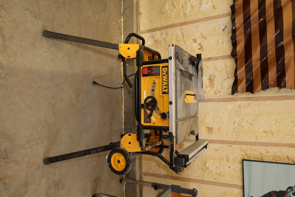 A DeWalt DWE7491 10-inch portable table saw mounted on a DeWalt rolling table saw stand. The saw is rated 120V AC, 15A, 60Hz, with a no-load speed of approximately 4,800 RPM and is equipped with a rack-and-pinion fence system, miter gauge, blade guard assembly, and onboard adjustment controls. The rolling stand features integrated wheels and folding legs for mobility and storage. No equipment is onsite to assist loading. Bring the proper tools, equipment, and help needed to load your items. Seller reports: nearly all the powertool (especially Festools) are in fantastic condition, low low use and have been kept in climate controlled garage.
