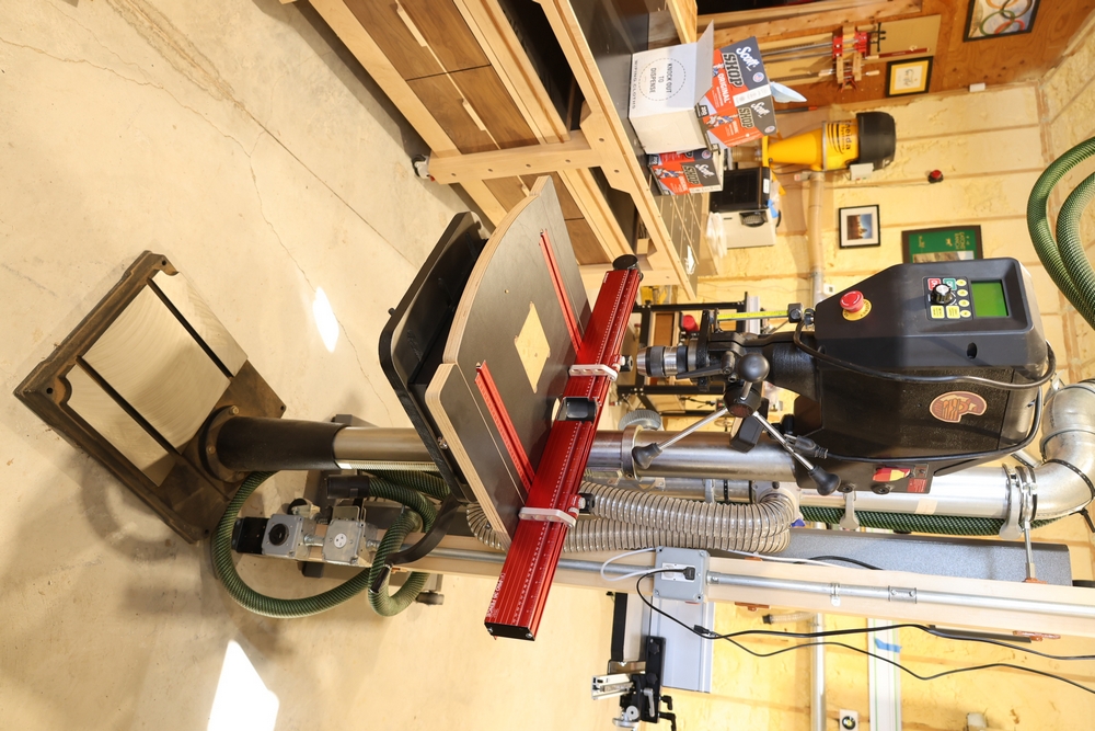 PantoRouter woodworking machine by WoodCraft Solutions LLC, equipped with a Bosch 1617EVS router motor, adjustable pantograph mechanism, aluminum work table, and clear safety guard, mounted on a benchtop base with the PantoRouter table assembly and controls. No equipment is onsite to assist loading. Bring the proper tools, equipment, and help needed to load your items. Seller reports: nearly all the powertool (especially Festools) are in fantastic condition, low low use and have been kept in climate controlled garage.