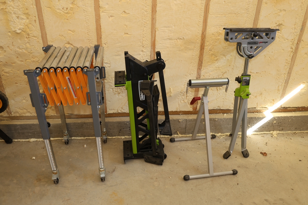 Assorted material support and work stands including an expandable accordion-style roller stand, a Rockwell JawStand model RK9033 adjustable support stand, an HDX ball bearing roller stand (SKU 483 048), and a Rockwell JawHorse Sheetmaster portable clamping workstation. The group includes mixed roller and support styles suitable for material handling, cutting, and shop support applications. No equipment is onsite to assist loading. Bring the proper tools, equipment, and help needed to load your items.