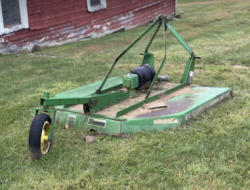 John Deere rotary cutter, three point hitch type, with PTO shaft, gearbox, and rear tail wheel assembly. Photographed both prior to winter storage and as currently located. No model or serial number observed. Stored outdoors. Snow will be cleared to machine prior to pickup. No equipment is onsite to assist loading. Bring the proper tools, equipment, and help needed to load your items.