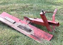 Rhino BX66 rear blade, three point hitch mounted, orange finish, manual angle adjustment with pin style pivot, cutting edge installed. Shown in fall condition and again partially buried in snow. Snow will be cleared to machine prior to pickup. No equipment is onsite to assist loading. Bring the proper tools, equipment, and help needed to load your items.