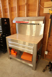 A Kobalt rolling tool cabinet/workbench with a hardwood work surface, stainless steel drawer fronts, and multiple storage drawers, fitted with a SawStop-branded pegboard back panel. Cabinet width measures approximately 60 inches. Includes the contents shown, consisting of assorted bar clamps, a DeWalt 4-amp waterproof battery charger, extension cords, and miscellaneous shop items stored within the drawers. Mounted on casters for mobility. No equipment is onsite to assist loading. Bring the proper tools, equipment, and help needed to load your items.